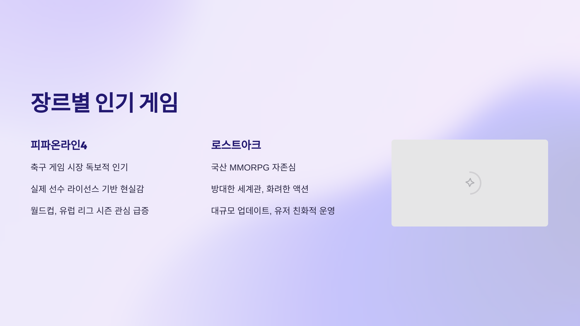 - 특정 장르 선호도 뚜렷: MOBA(LoL), 스포츠(피파온라인4), MMORPG(로스트아크) 등 특정 장르에 대한 국내 유저들의 선호도가 뚜렷하게 나타납니다. 이들 장르는 탄탄한 코어 유저층을 바탕으로 안정적인 시장을 형성하고 있습니다.