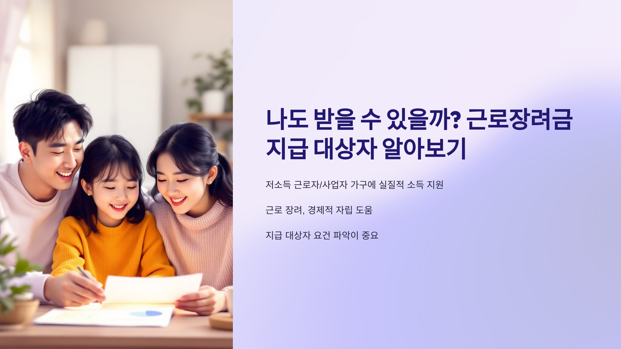 열심히 일해도 늘 빠듯한 살림살이에 힘겨워하는 분들에게 '근로장려금'은 가뭄의 단비와 같은 소중한 지원입니다. 이는 저소득 근로자 또는 사업자(전문직 제외) 가구에 대해 실질적인 소득을 지원함으로써 근로를 장려하고 경제적 자립을 돕기 위해 마련된 제도입니다. 하지만 좋은 제도라도 내가 대상이 되는지, 어떤 조건을 갖춰야 하는지 모른다면 그림의 떡일 뿐입니다. 따라서 근로장려금 지급 대상자 요건을 미리 파악하고 자신이 해당되는지 알아보는 것은 매우 중요하며, 놓치지 않고 혜택을 받기 위한 첫걸음입니다.