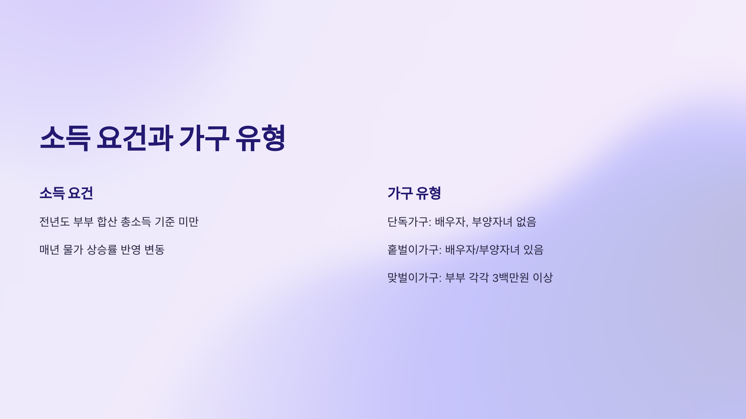 근로장려금 지급 대상자를 결정하는 가장 핵심적인 기준은 바로 '소득 요건'과 '가구 유형'입니다. 우선, 전년도(또는 해당 반기)의 부부 합산 총소득 금액이 국세청에서 정한 기준 금액 미만이어야 합니다. 이 기준 금액은 매년 물가 상승률 등을 반영하여 조금씩 변동될 수 있으며, 가구 유형에 따라 다르게 적용됩니다. 가구 유형은 크게 단독가구(배우자, 부양자녀, 70세 이상 직계존속이 없는 가구), 홑벌이가구(배우자 또는 부양자녀 또는 70세 이상 직계존속이 있는 가구로서 맞벌이가구가 아닌 가구), 맞벌이가구(신청인과 배우자 각각의 총급여액 등이 3백만원 이상인 가구)로 나뉩니다. 일반적으로 맞벌이가구의 소득 기준이 가장 높고, 단독가구의 소득 기준이 가장 낮게 설정됩니다. 따라서 본인이 어떤 가구 유형에 속하는지 먼저 파악하고, 해당 가구 유형의 연간 총소득 기준을 충족하는지 확인하는 것이 가장 중요합니다.