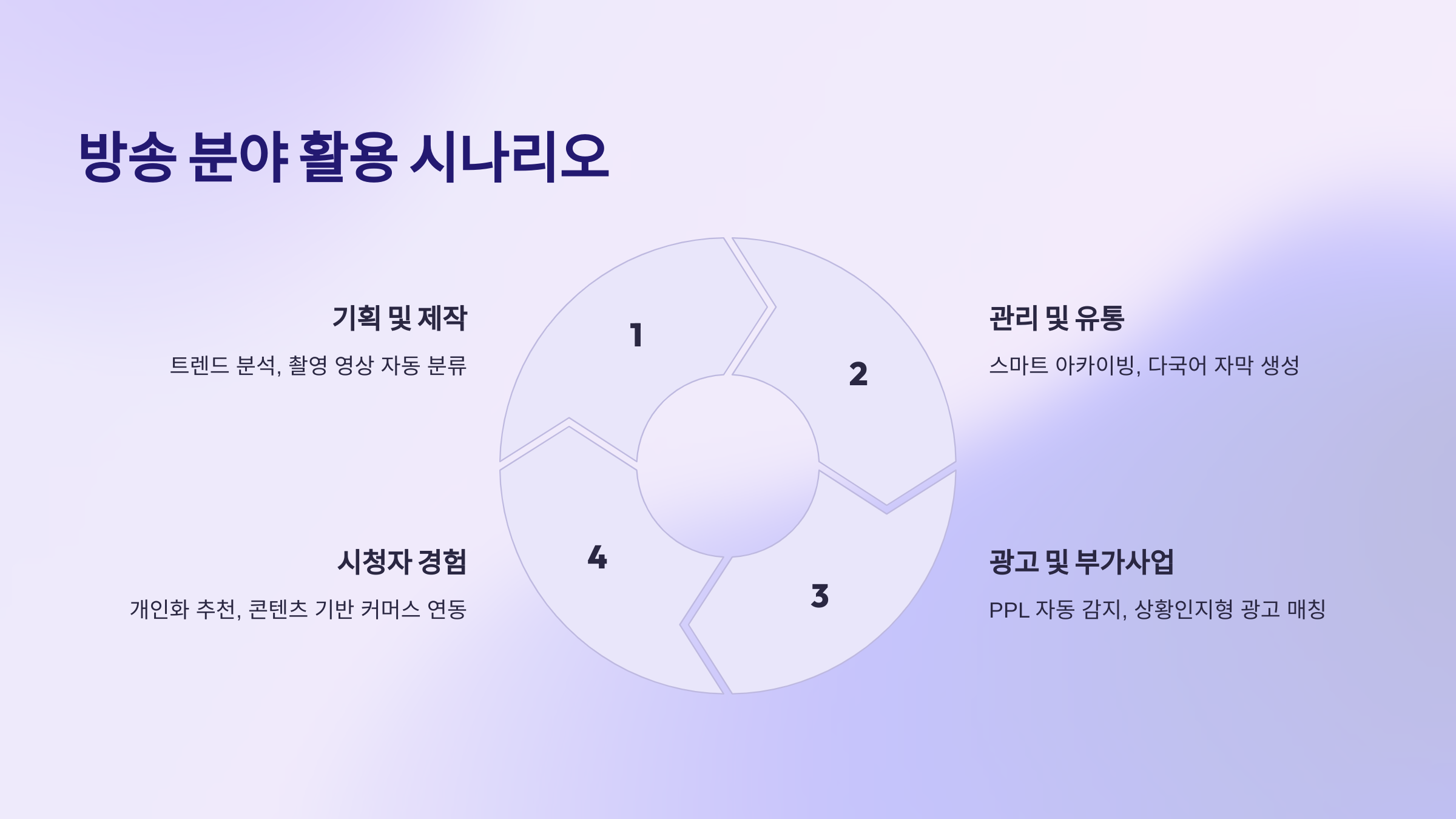 • 이는 프로그램 정보 자동 생성, PPL 광고 효과 분석, 저작권 관리 등에 유용하게 활용될 수 있습니다.