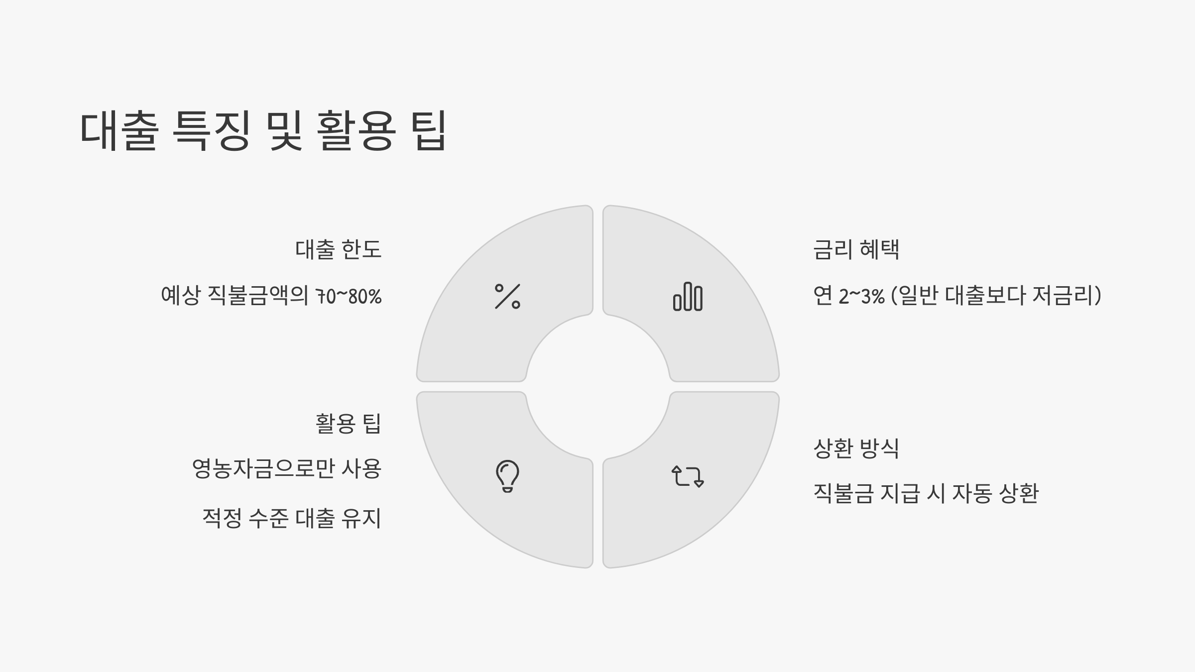 공익직불금대출은 농업인이 직불금을 받기 전에 미리 자금을 활용할 수 있도록 하는 제도입니다. 직불금 수령 자격이 확인된 농업인은 예상 직불금액의 일정 비율을 미리 대출 형태로 받을 수 있습니다. 이후 실제 직불금이 지급되면 대출금을 상환하는 구조입니다. 이 제도의 가장 큰 특징은 일반 대출보다 낮은 금리와 간소화된 절차에 있습니다.