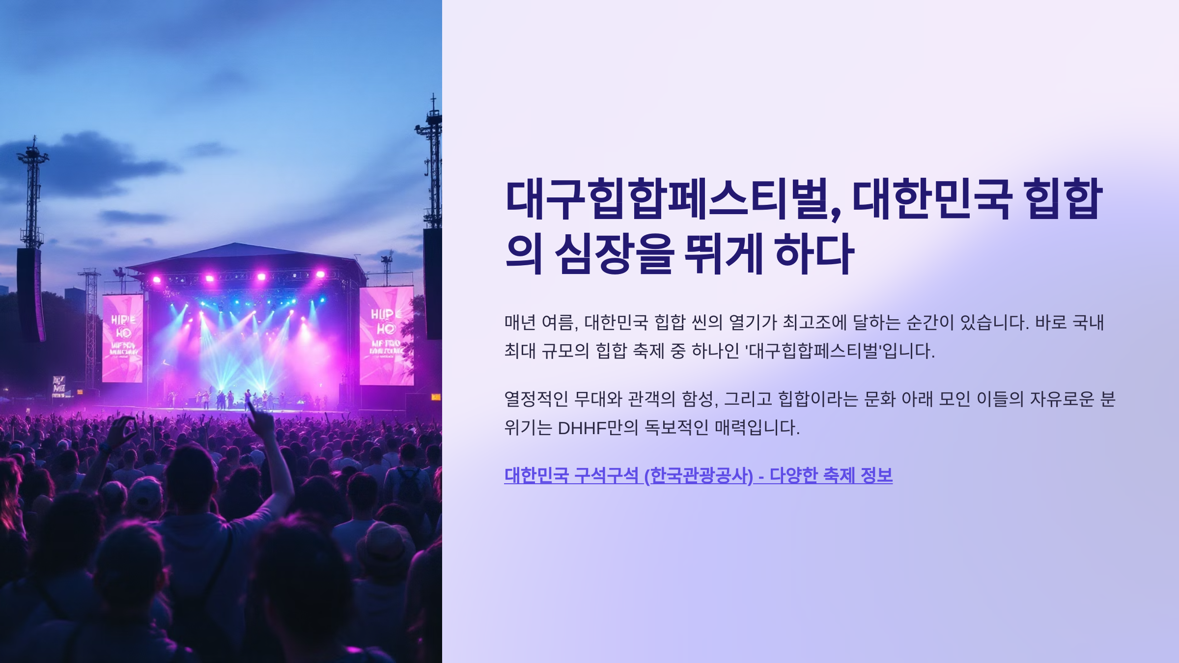 매년 여름, 대한민국 힙합 씬의 열기가 최고조에 달하는 순간이 있습니다. 바로 국내 최대 규모의 힙합 축제 중 하나로 손꼽히는 '대구힙합페스티벌(Daegu Hip Hop Festival, 이하 DHHF)'이 열리는 때입니다. 단순히 여러 힙합 공연을 모아 놓은 것을 넘어, DHHF는 한국 힙합의 현재와 미래를 조망하고, 아티스트와 팬들이 하나 되어 뜨거운 에너지를 발산하는 상징적인 행사로 자리매김했습니다. 대구라는 도시에서 펼쳐지는 이 거대한 힙합의 향연은 전국의 힙합 팬들을 설레게 하며, 매년 여름을 기다리게 만드는 강력한 이유가 되고 있습니다. 열정적인 무대와 관객의 함성, 그리고 힙합이라는 문화 아래 모인 이들의 자유로운 분위기는 DHHF만의 독보적인 매력입니다.