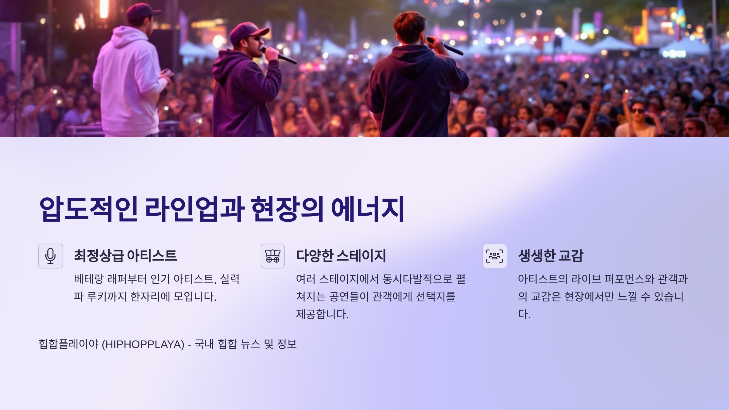 DHHF가 특별한 이유는 무엇보다 국내 최정상급 힙합 아티스트부터 주목받는 신예까지 아우르는 압도적인 라인업에 있습니다. 매년 발표되는 라인업은 그 자체로 큰 화제를 모으며, 힙합 팬들의 기대를 한 몸에 받습니다. 씬을 대표하는 베테랑 래퍼들, 음원 차트를 휩쓰는 인기 아티스트, 그리고 앞으로가 더욱 기대되는 실력파 루키들이 한자리에 모여 각자의 개성 넘치는 무대를 선보입니다. 여러 스테이지에서 동시다발적으로 펼쳐지는 공연들은 관객들에게 다양한 선택지를 제공하며, 쉴 틈 없이 힙합의 매력에 빠져들게 만듭니다. 단순히 음악을 듣는 것을 넘어, 아티스트의 라이브 퍼포먼스가 주는 생생한 에너지와 관객과의 교감은 오직 페스티벌 현장에서만 느낄 수 있는 짜릿한 경험입니다. 뜨거운 태양 아래 펼쳐지는 열정적인 무대는 대한민국 힙합 씬의 현재를 가장 뜨겁게 느낄 수 있는 기회를 제공합니다.