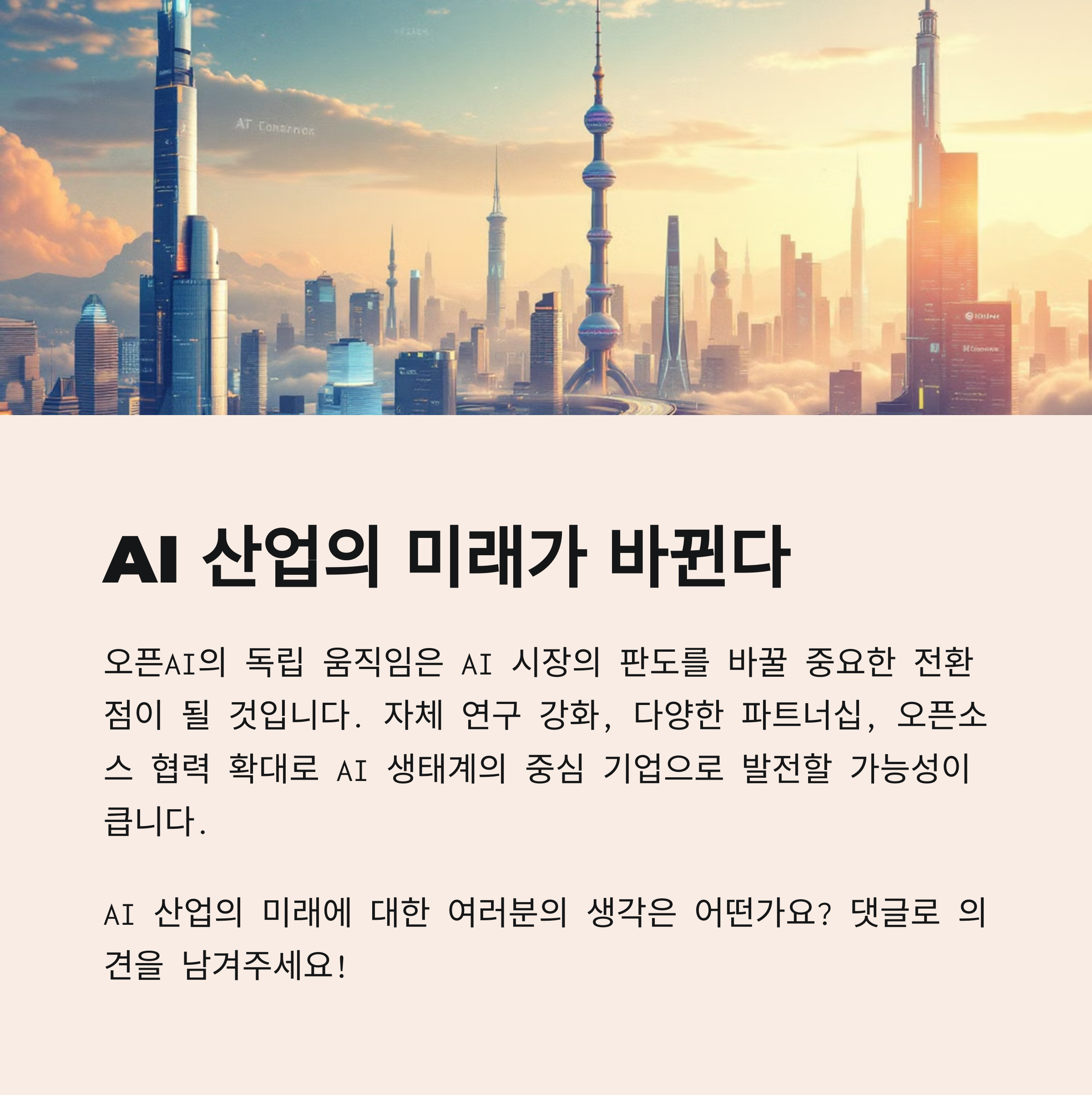 앞으로 오픈AI가 얼마나 성공적으로 독립을 이룰지, 그리고 AI 시장이 어떤 방향으로 흘러갈지는 계속 지켜봐야 할 부분입니다. 여러분은 오픈AI의 이 움직임에 대해 어떻게 생각하시나요? AI 산업의 미래에 대한 여러분의 의견을 댓글로 남겨주세요!