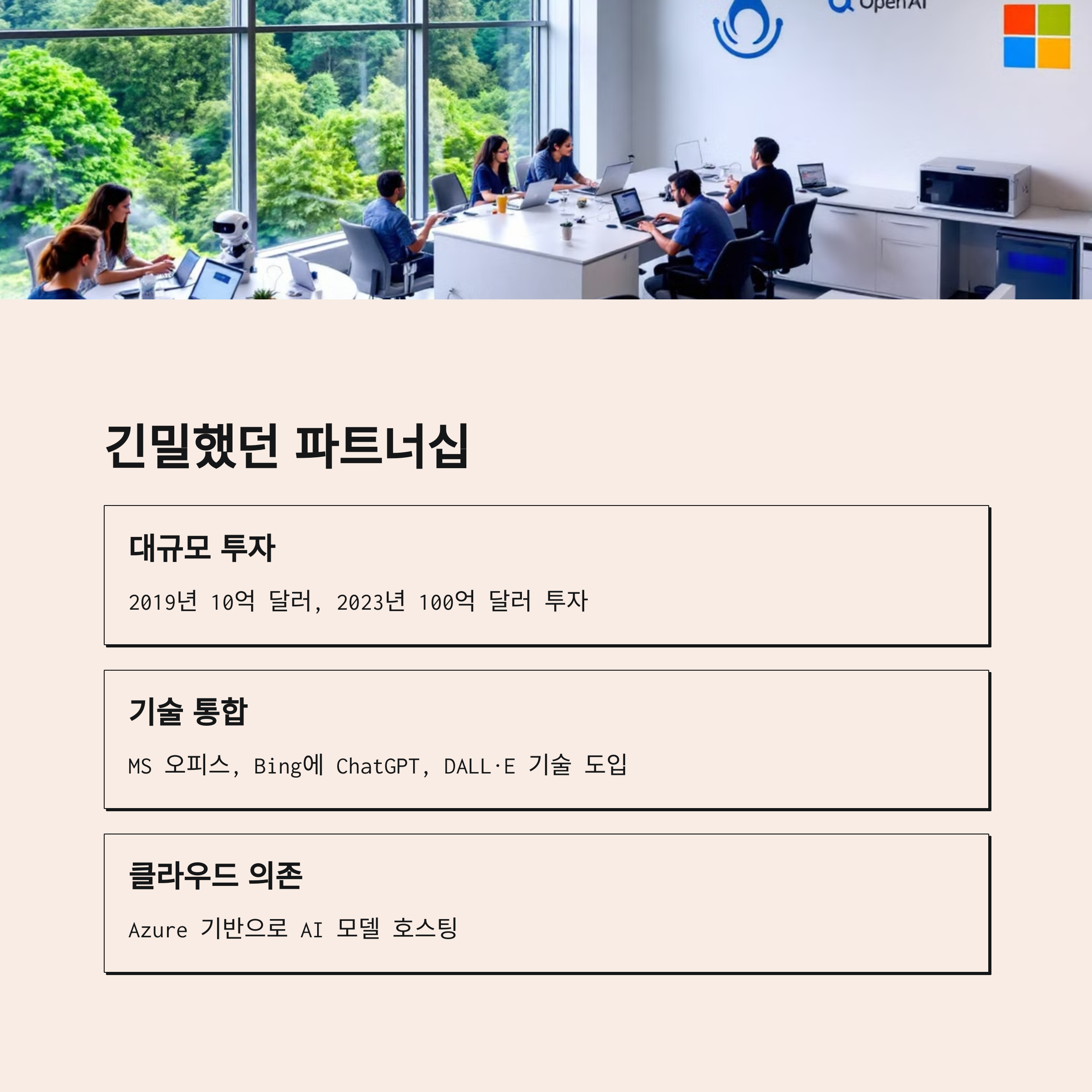 오픈AI(OpenAI)와 마이크로소프트(Microsoft)의 관계는 단순한 파트너십을 넘어선 긴밀한 협력 관계였습니다. 마이크로소프트는 오픈AI의 주요 투자자로, 2019년 10억 달러를 투자한 이후 지속적으로 협력을 확대했습니다. 2023년에는 100억 달러 규모의 추가 투자를 통해 오픈AI의 연구 및 개발을 지원하며, 자사 클라우드 서비스인 Azure를 기반으로 오픈AI의 AI 모델을 호스팅할 수 있도록 했습니다.