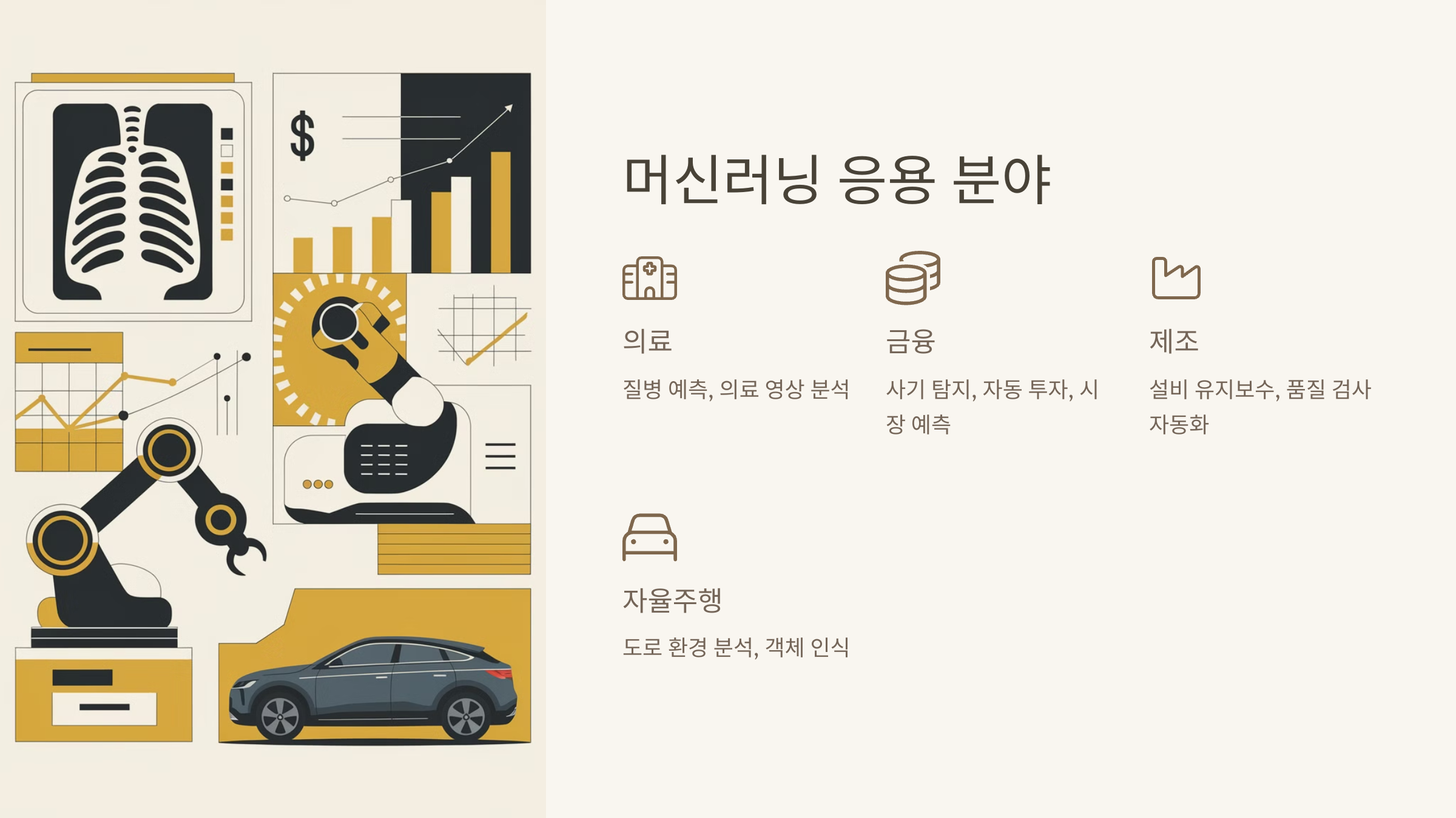 - 자율주행차: 머신러닝을 활용하여 보행자 감지, 신호등 인식, 도로 환경 분석