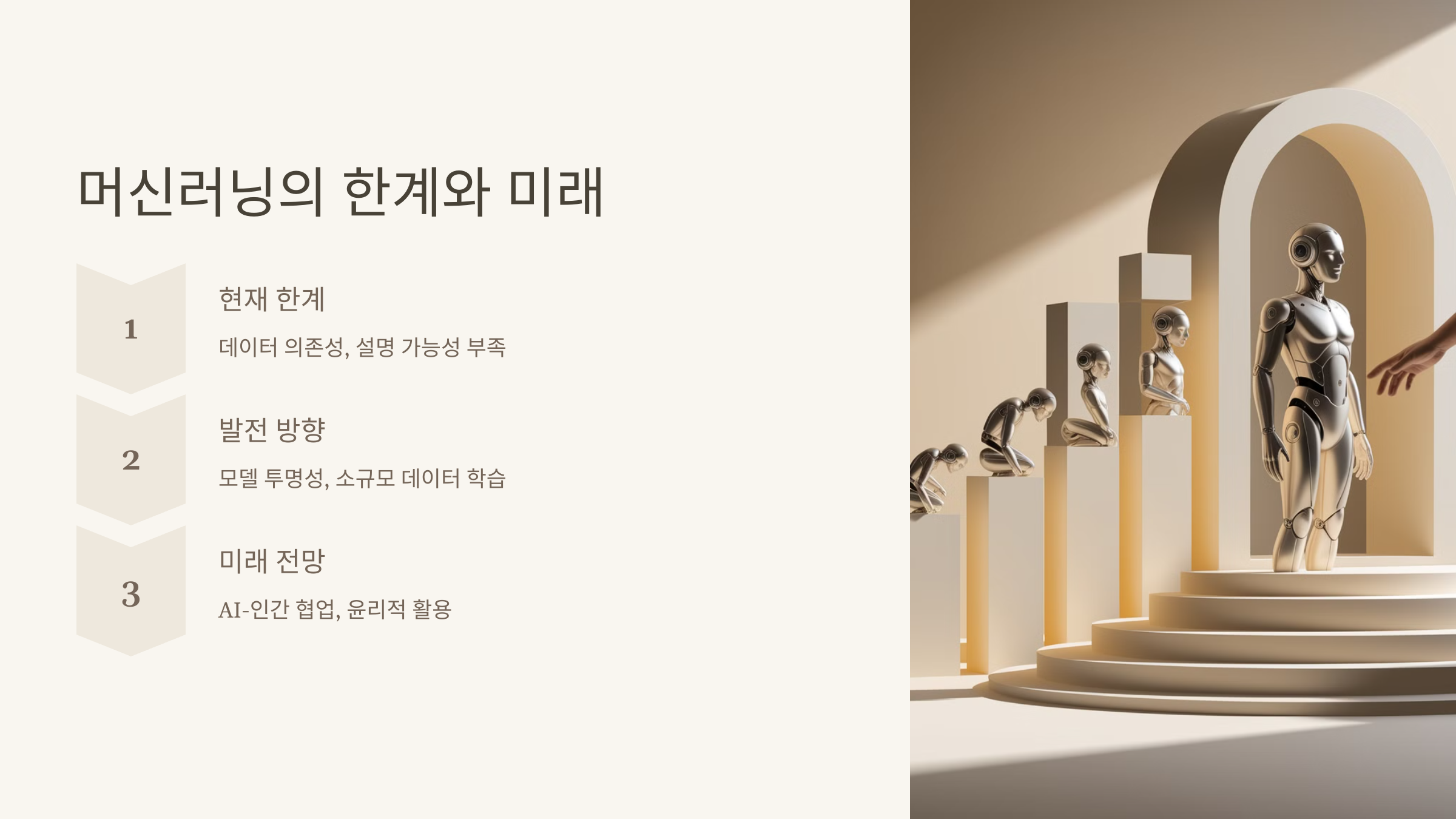 머신러닝은 강력한 기술이지만 몇 가지 한계를 가지고 있으며, 이를 해결하기 위한 연구가 계속되고 있습니다.