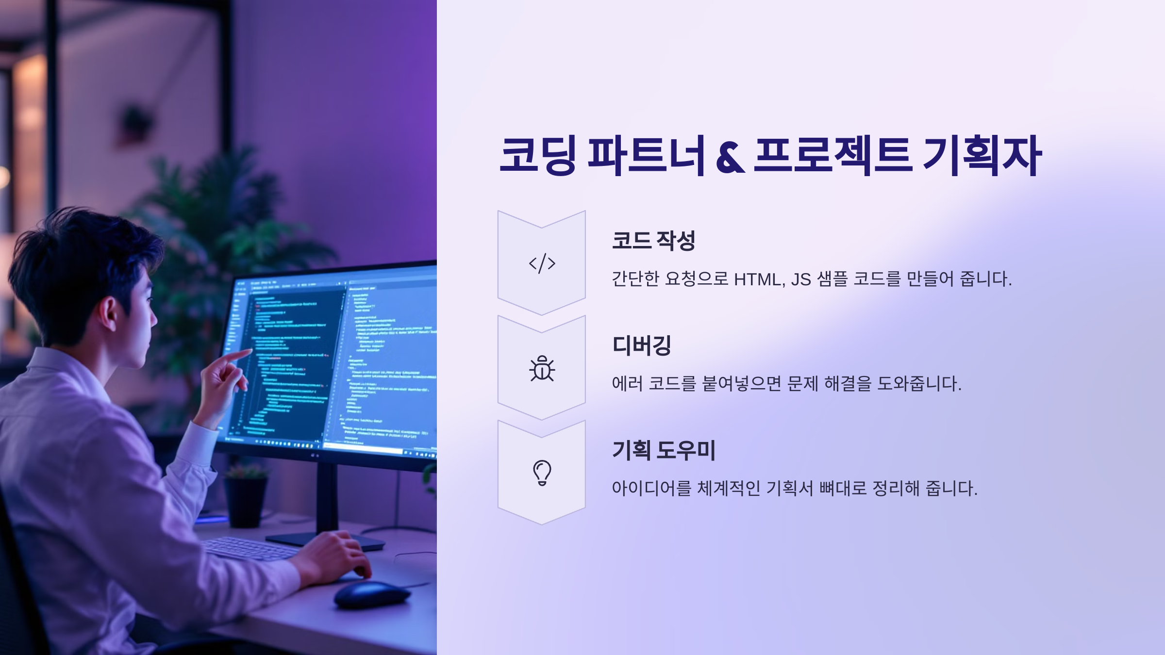 개발자 아니어도 코딩하고 싶은 순간 있죠. "이 버튼 누르면 이메일 보내지게 하고 싶어"라고 말하면, GPT는 HTML + JS 샘플 코드까지 만들어줘요. 에러가 나면 복붙해서 "왜 안 되냐고 ㅠㅠ" 해보세요. 디버깅도 됩니다. 혼자 하는 사이드 프로젝트에 이만한 든든한 동료는 없어요.