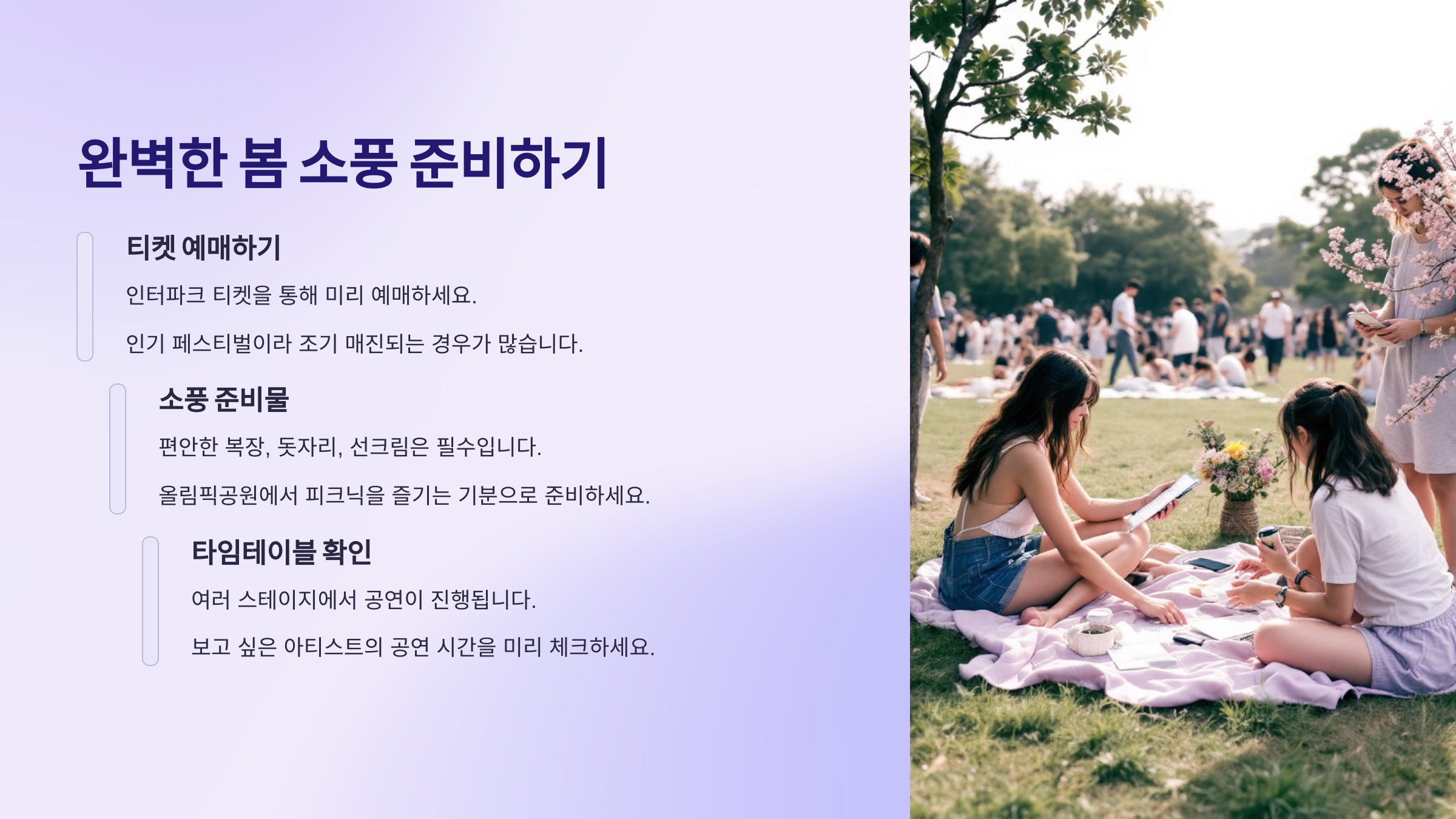 살랑이는 봄바람과 함께 우리의 마음을 설레게 하는 대표적인 봄 음악 축제, 뷰티풀 민트 라이프(Beautiful Mint Life, BML)가 있습니다. 이름처럼 싱그럽고 청량한 에너지를 선사하는 BML은 단순한 음악 공연을 넘어, 따스한 햇살 아래 잔디밭에 돗자리를 펴고 앉아 감미로운 음악을 즐기는 도심 속 봄 소풍과 같은 특별한 경험을 선사합니다. 매년 봄, 음악 팬들의 달력에 빼놓을 수 없는 중요한 행사로 자리 잡으며, 새로운 시작과 설렘을 음악과 함께 만끽하게 합니다. BML은 단순한 페스티벌이 아닌, 봄 그 자체를 상징하는 하나의 문화 아이콘으로 많은 이들의 사랑을 받고 있습니다.