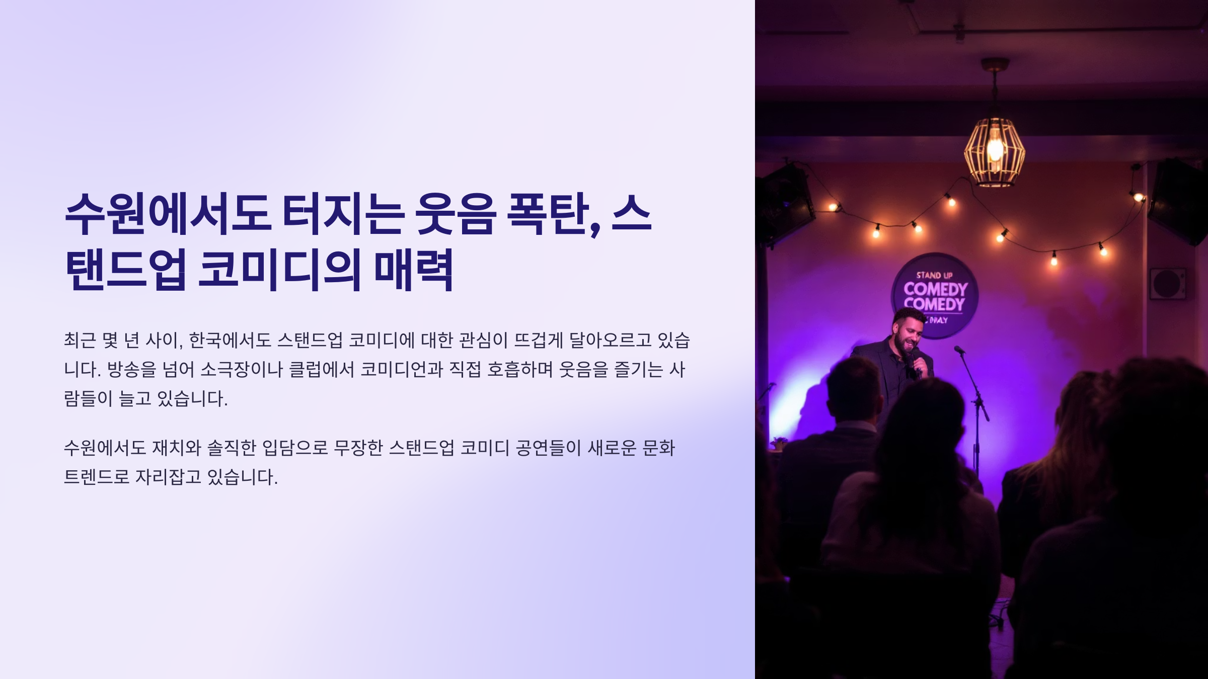 스탠드업 코미디, 수원 코미디, 수원 공연, 코미디 쇼, 오픈 마이크, 수원 놀거리, 수원 데이트, 코미디언, 유머, 지역 문화