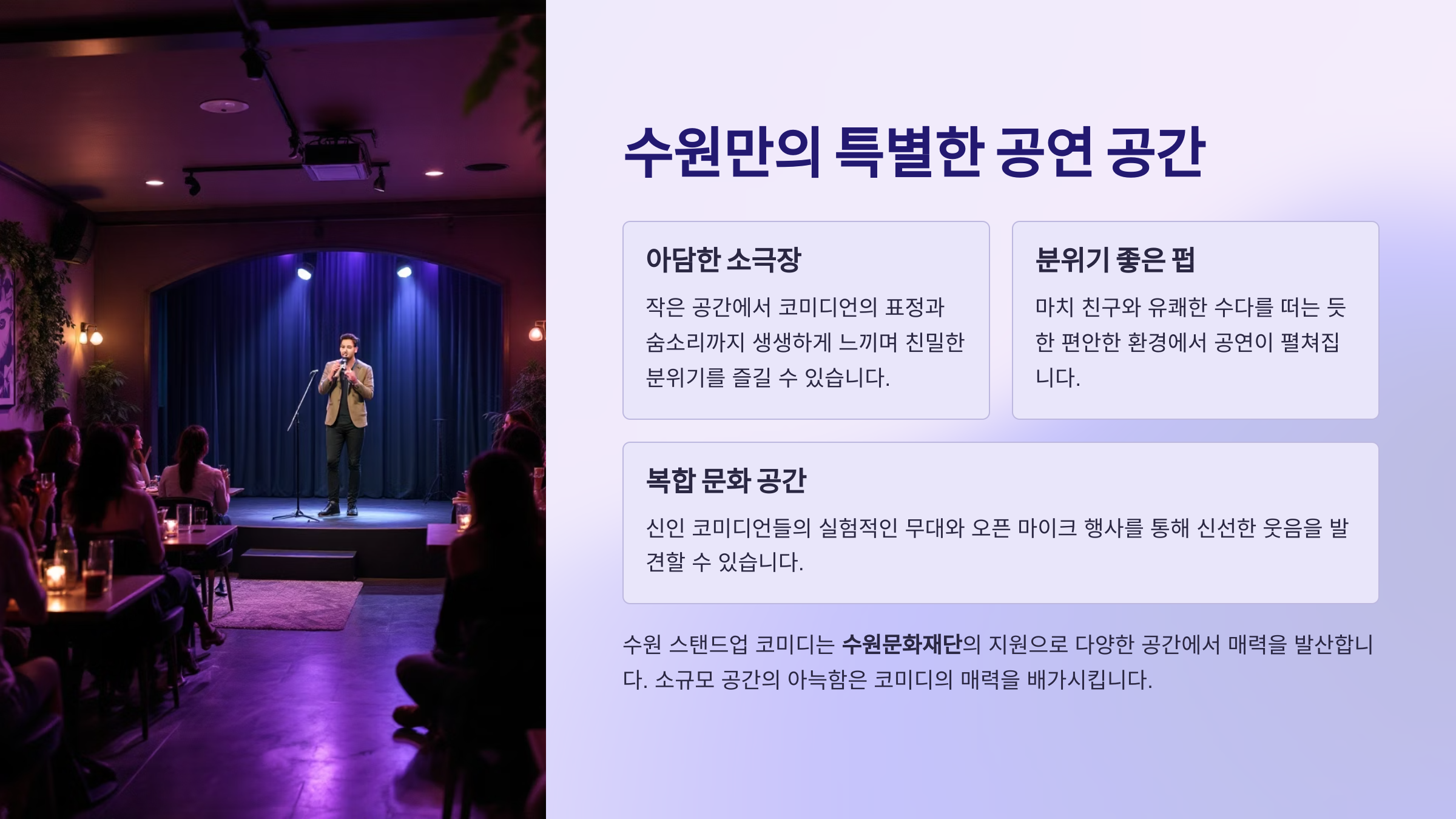 수원의 스탠드업 코미디 씬은 아직 서울처럼 전용 클럽이 활성화된 단계는 아닐 수 있지만, 오히려 그래서 더 특별하고 다양한 공간에서 매력을 발산합니다. 아담한 소극장이나 분위기 좋은 펍, 때로는 복합 문화 공간에서 열리는 공연들은 관객과 코미디언 사이의 거리를 더욱 가깝게 만듭니다. 덕분에 코미디언의 표정 하나, 숨소리 하나까지 생생하게 느끼며 마치 친구와 유쾌한 수다를 떠는 듯한 친밀한 분위기 속에서 공연을 즐길 수 있습니다. 또한, 수원 지역을 기반으로 활동하는 신인 코미디언들의 실험적인 무대나 오픈 마이크 행사를 통해 예상치 못한 신선한 웃음을 발견하는 재미도 쏠쏠합니다. 대형 공연장에서는 느낄 수 없는, 소규모 공간 특유의 아늑함과 집중도 높은 환경은 스탠드업 코미디의 매력을 배가시키는 중요한 요소입니다.