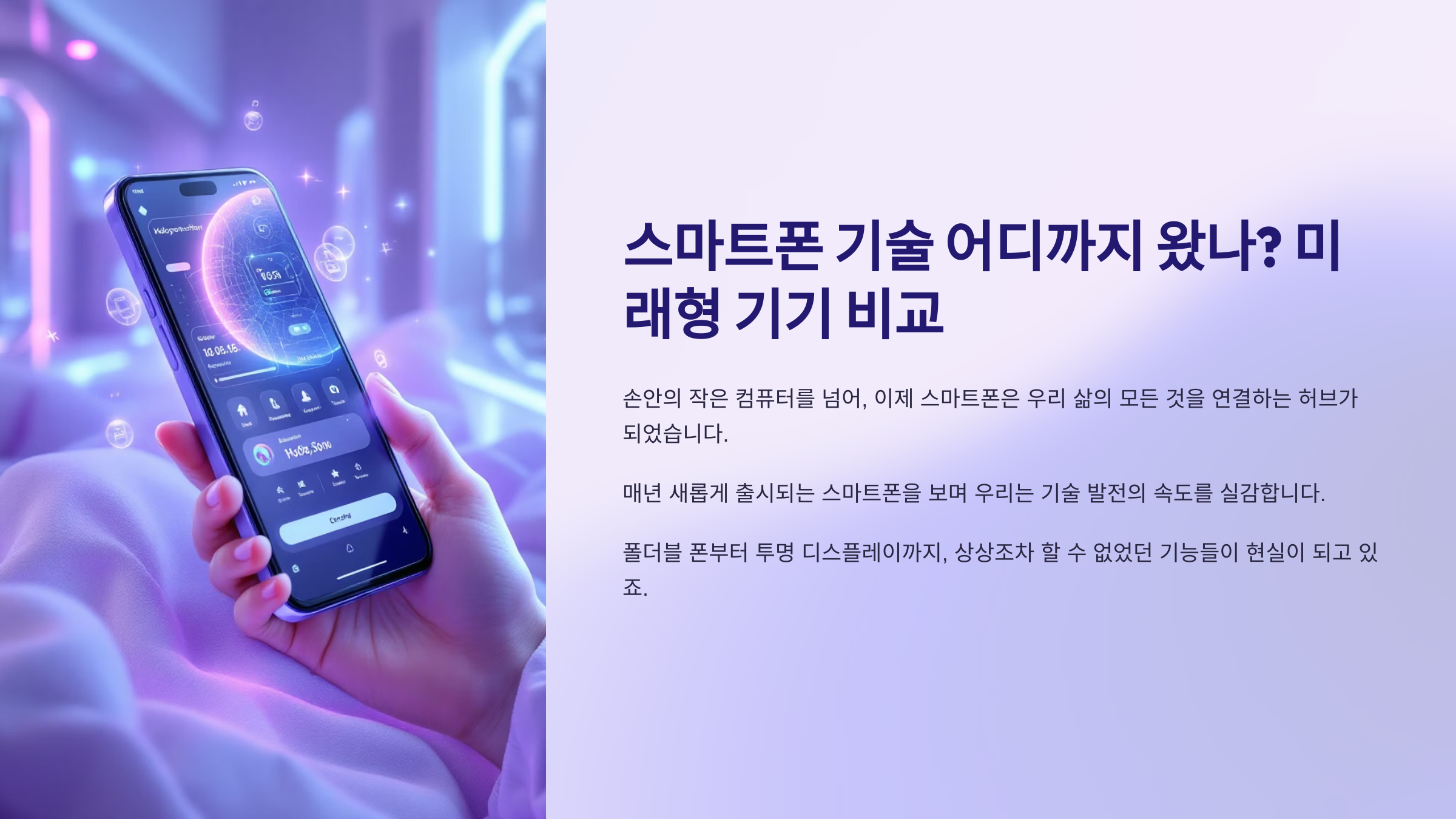 안녕하세요, 여러분! IT 트렌드를 읽어주는 블로거입니다. 매년 새롭게 출시되는 스마트폰을 보며 우리는 기술 발전의 속도를 실감합니다. 폴더블 폰부터 투명 디스플레이까지, 상상조차 할 수 없었던 기능들이 현실이 되고 있죠. 이번 글에서는 현재 스마트폰 기술의 최전선을 살펴보고, 앞으로 다가올 미래형 기기들이 어떤 모습일지 함께 상상하고 비교해보는 시간을 갖겠습니다. 흥미진진한 미래 기술의 세계로 함께 떠나보시죠!