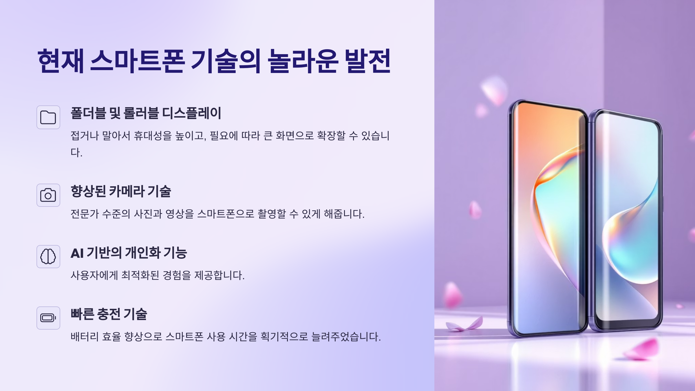 최근 몇 년간 스마트폰 기술은 눈부신 발전을 이루었습니다. 단순히 성능 향상을 넘어, 사용자 경험을 혁신하는 다양한 기술들이 등장했죠. 특히 폴더블 및 롤러블 디스플레이 기술은 스마트폰의 형태를 완전히 바꾸어 놓았습니다. 접거나 말아서 휴대성을 높이고, 필요에 따라 큰 화면으로 확장하여 사용할 수 있게 되었죠. 또한, 향상된 카메라 기술은 전문가 수준의 사진과 영상을 스마트폰으로 촬영할 수 있게 해주며, AI 기반의 개인화 기능은 사용자에게 최적화된 경험을 제공합니다. 더불어 빠른 충전 기술과 배터리 효율 향상은 스마트폰 사용 시간을 획기적으로 늘려주었습니다.