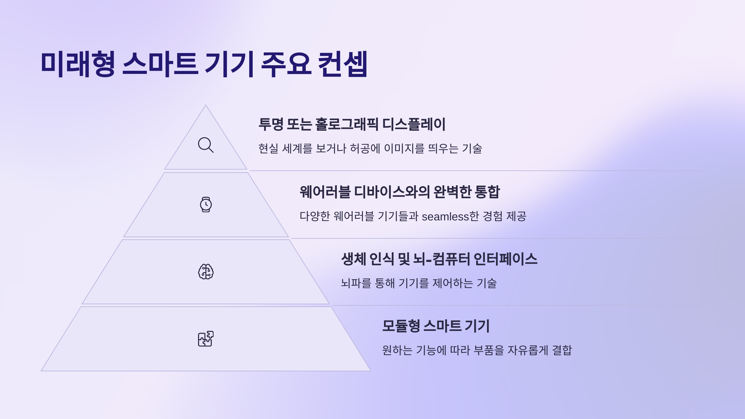 미래의 스마트 기기는 현재의 스마트폰과는 또 다른 형태와 기능을 갖출 것으로 예상됩니다. 몇 가지 주요 컨셉을 살펴볼까요?