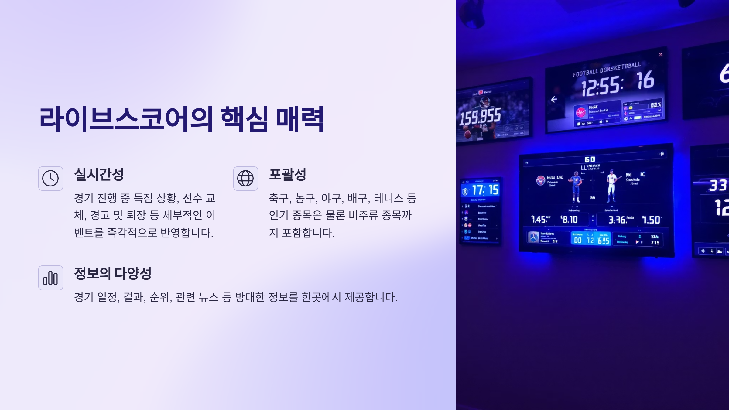 스포츠 팬이라면 누구나 응원하는 팀의 경기 결과를 실시간으로 확인하고 싶어 합니다. 중요한 득점 순간이나 경기 흐름의 변화를 놓치고 싶지 않은 마음은 당연합니다. 이러한 팬들의 니즈를 충족시켜주는 핵심 서비스가 바로 '라이브스코어'입니다. 전 세계 다양한 스포츠 종목의 경기 상황을 실시간으로 전달하며, 단순한 점수 업데이트를 넘어 경기 일정, 결과, 순위, 관련 뉴스 등 방대한 정보를 한곳에서 제공하는 정보의 허브 역할을 수행하고 있습니다. 스마트폰 터치 몇 번이면 언제 어디서든 원하는 스포츠 정보를 손쉽게 얻을 수 있어, 바쁜 일상 속에서도 스포츠의 열기를 놓치지 않게 해주는 필수적인 도구로 자리 잡았습니다.
