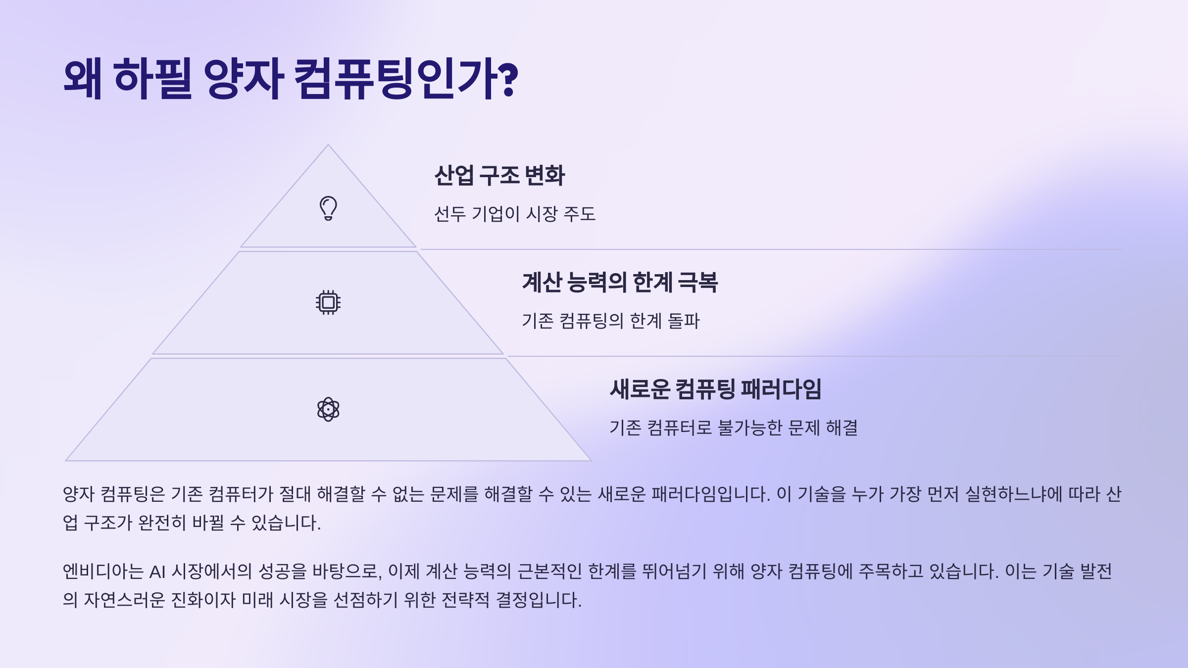 양자 컴퓨팅은 기존 컴퓨터가 절대 해결할 수 없는 문제를 해결할 수 있는 새로운 패러다임입니다. 그리고 그걸 누가 가장 먼저 실현하느냐에 따라 산업 구조가 바뀔 수 있어요. 엔비디아는 AI 시장에서 선두를 달리며 얻은 인프라와 생태계를 기반으로, 이제는 양자 세계로 눈을 돌렸습니다. 단순한 호기심이 아니라, 계산 능력의 한계를 뛰어넘기 위한 필연적인 선택이었죠.