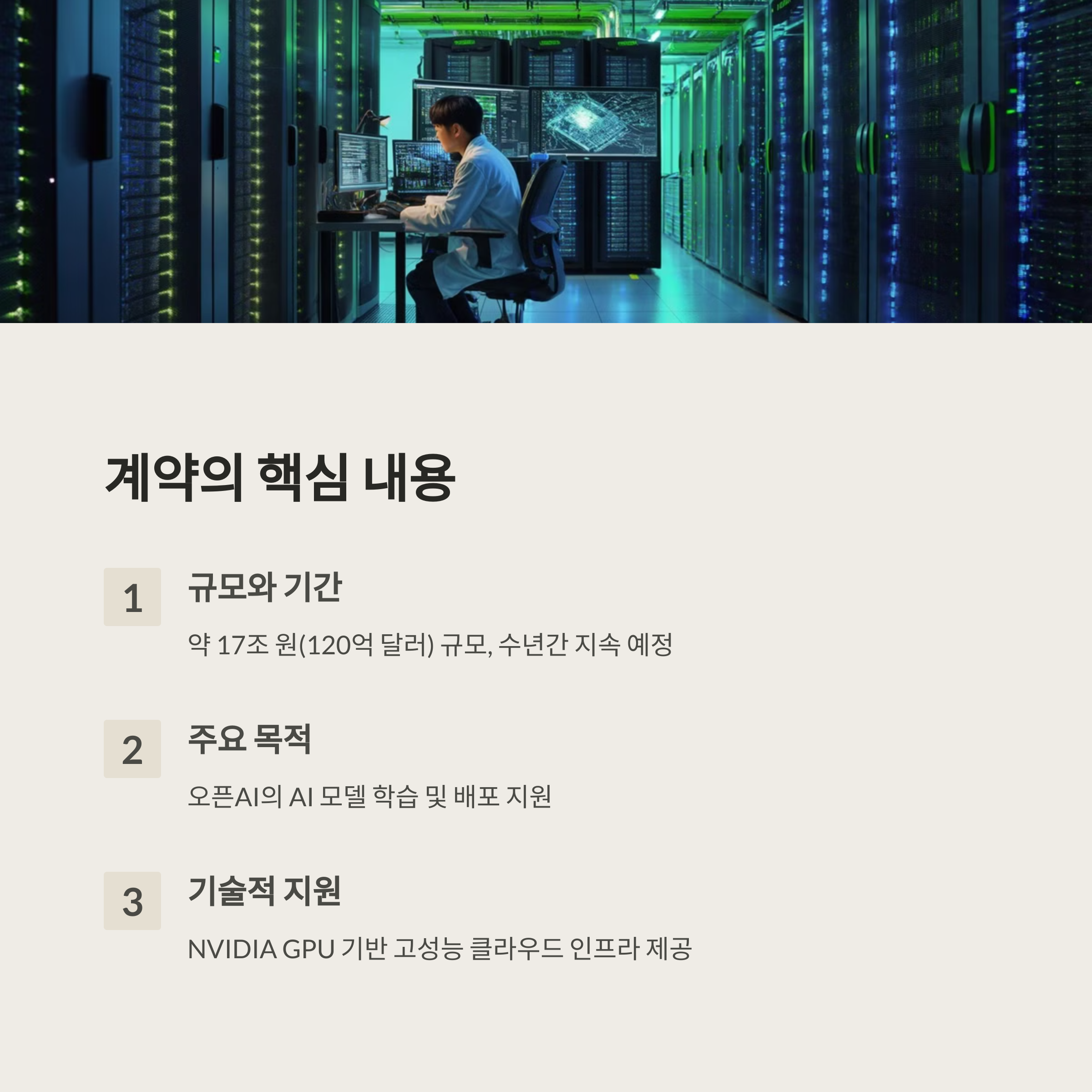 오픈AI와 코어위브의 17조 원 규모 계약은 AI 업계뿐만 아니라 클라우드 시장 전체에도 큰 파장을 일으키고 있습니다. 이 계약은 AI 연산 능력을 확보하는 것이 단순한 선택이 아니라 필수적인 요소로 자리 잡았음을 의미합니다.