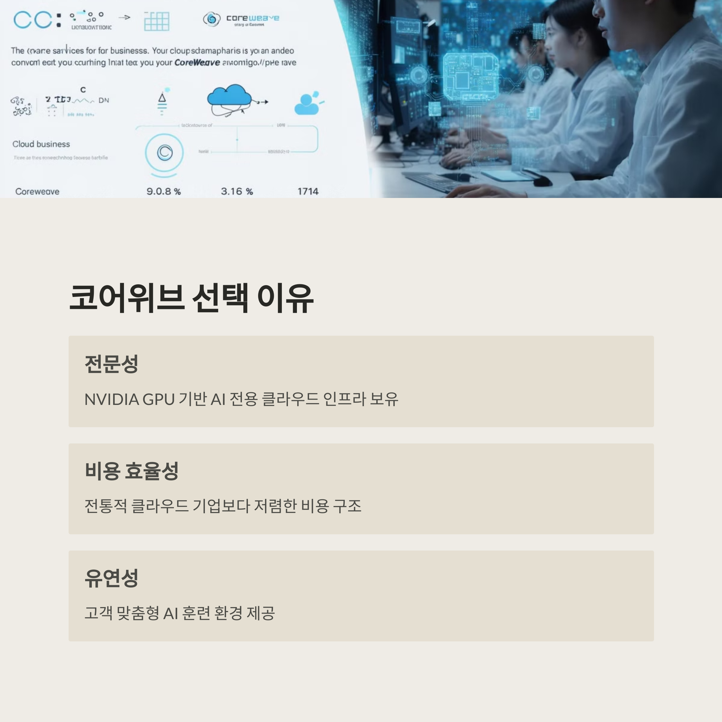 | CoreWeave | GPU 기반 AI 연산 최적화 | 인프라 규모가 상대적으로 작음 |