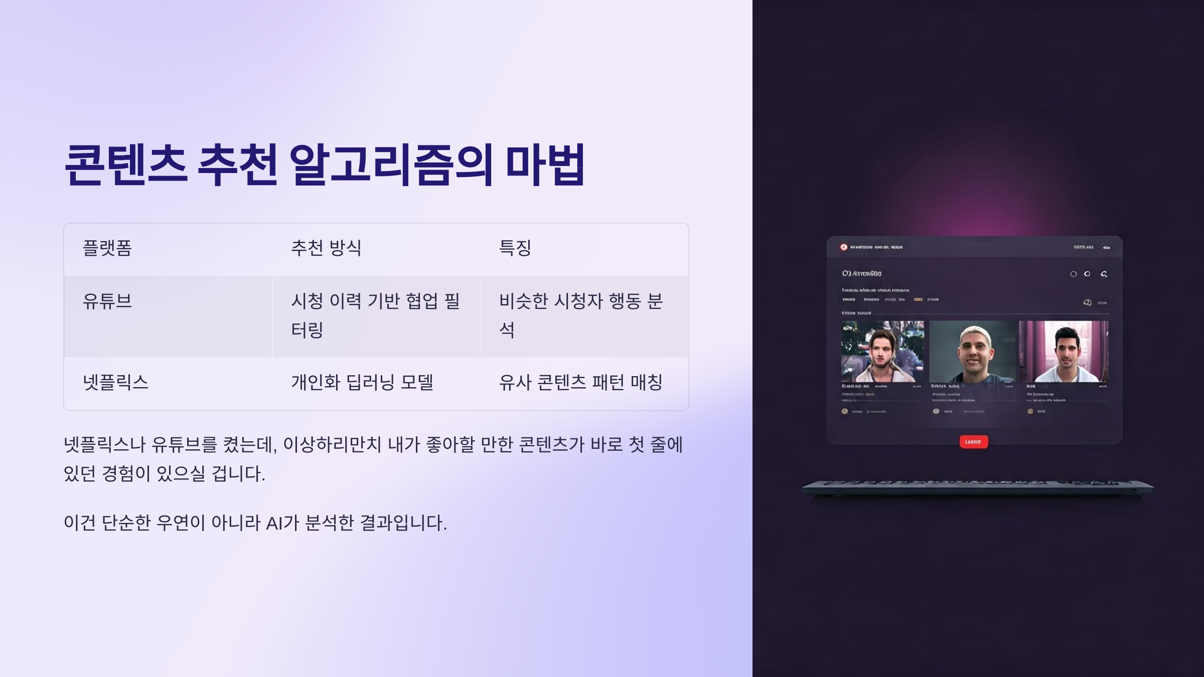 | 플랫폼 | 추천 방식 | 특징 |