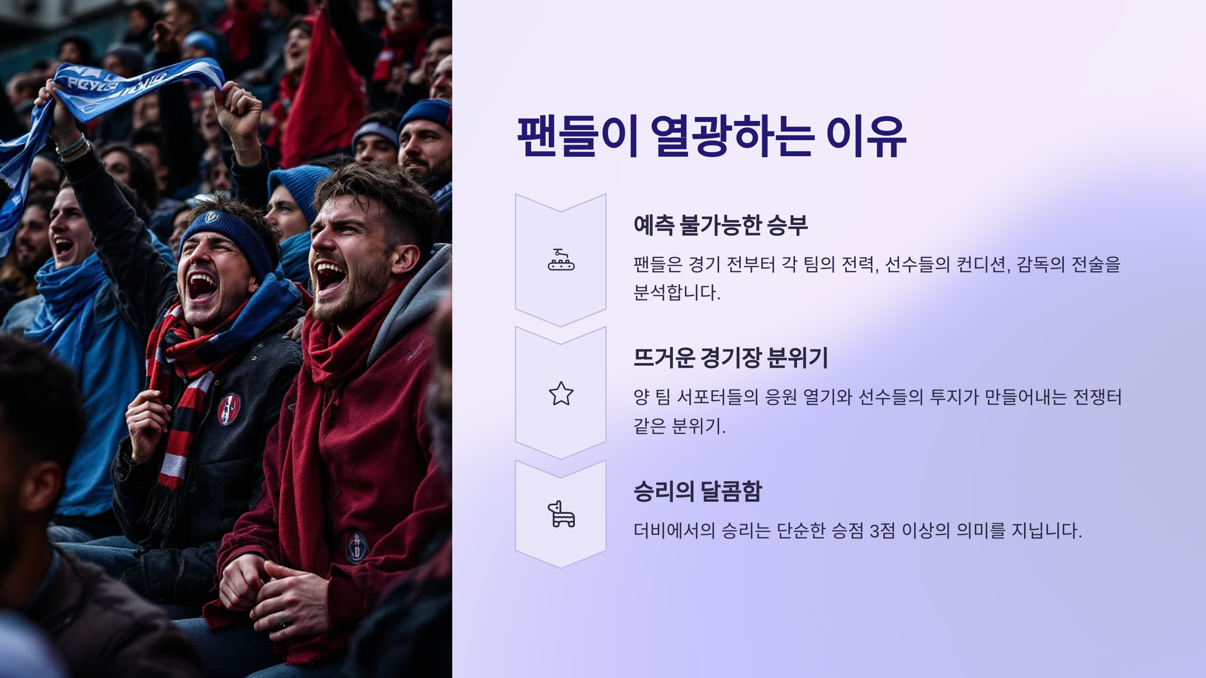 - 결과에 따른 희비와 '까방권' 획득: "와! 방금 인테르 대 밀란 경기 종료 휘슬 불었는데, 우리가 극장 골로 이겼다! 오늘 밤은 잠 못 잘 것 같아. 역시 더비 승리는 리그 우승만큼이나 짜릿해. 당분간 밀란 팬 친구들 앞에서 어깨 펴고 다닐 수 있겠네!" 더비에서의 승리는 단순한 승점 3점 이상의 의미를 지닙니다. 팬들에게는 라이벌 팀을 상대로 거둔 승리라는 자부심과 함께, 한동안 다른 경기 결과가 좋지 않더라도 비판을 면할 수 있는 일종의 '까임 방지권'을 얻는 것과 같은 기쁨을 선사합니다.