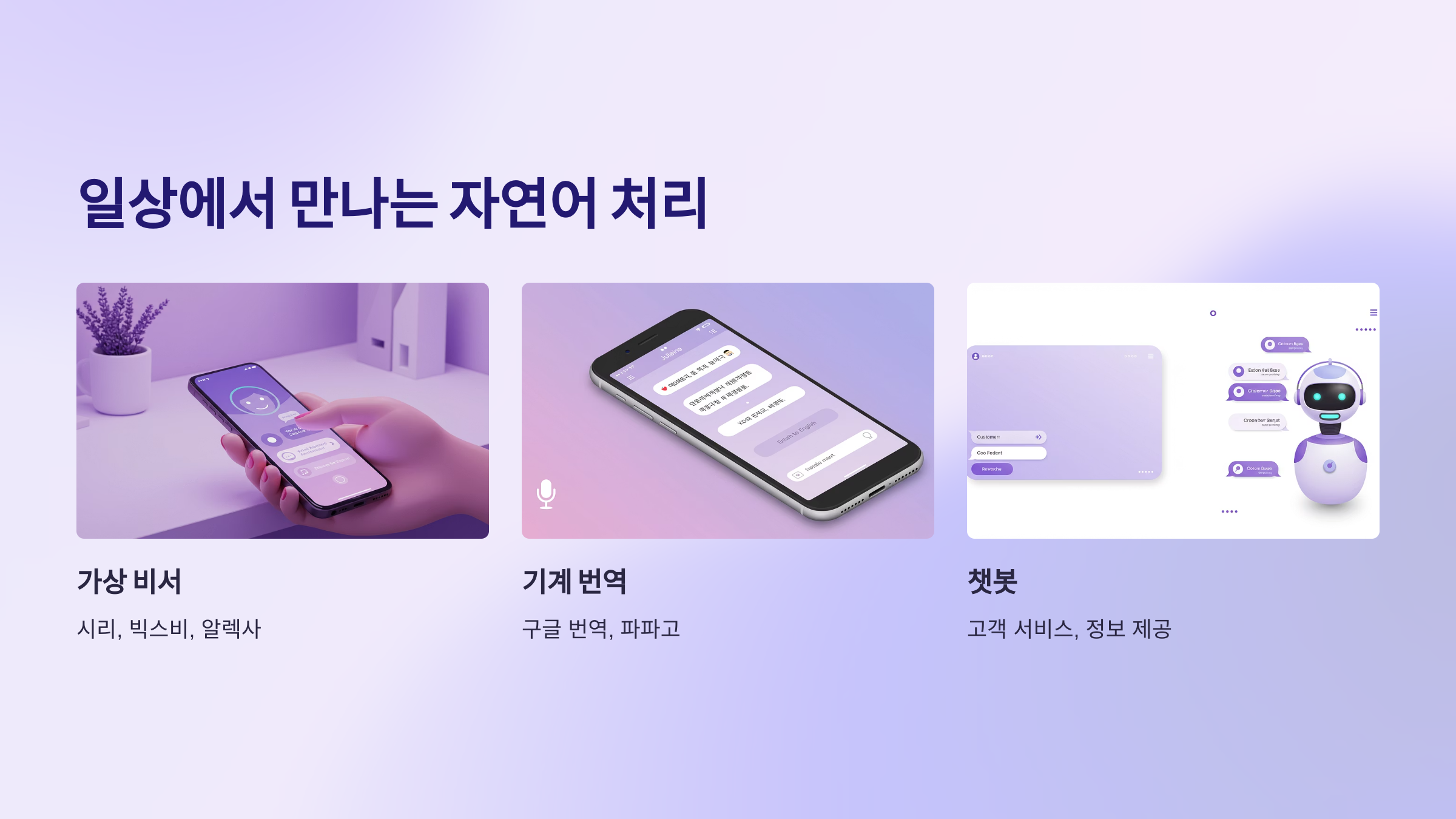 | 기계 번역 | 구글 번역, 파파고 등의 다국어 번역 서비스 |