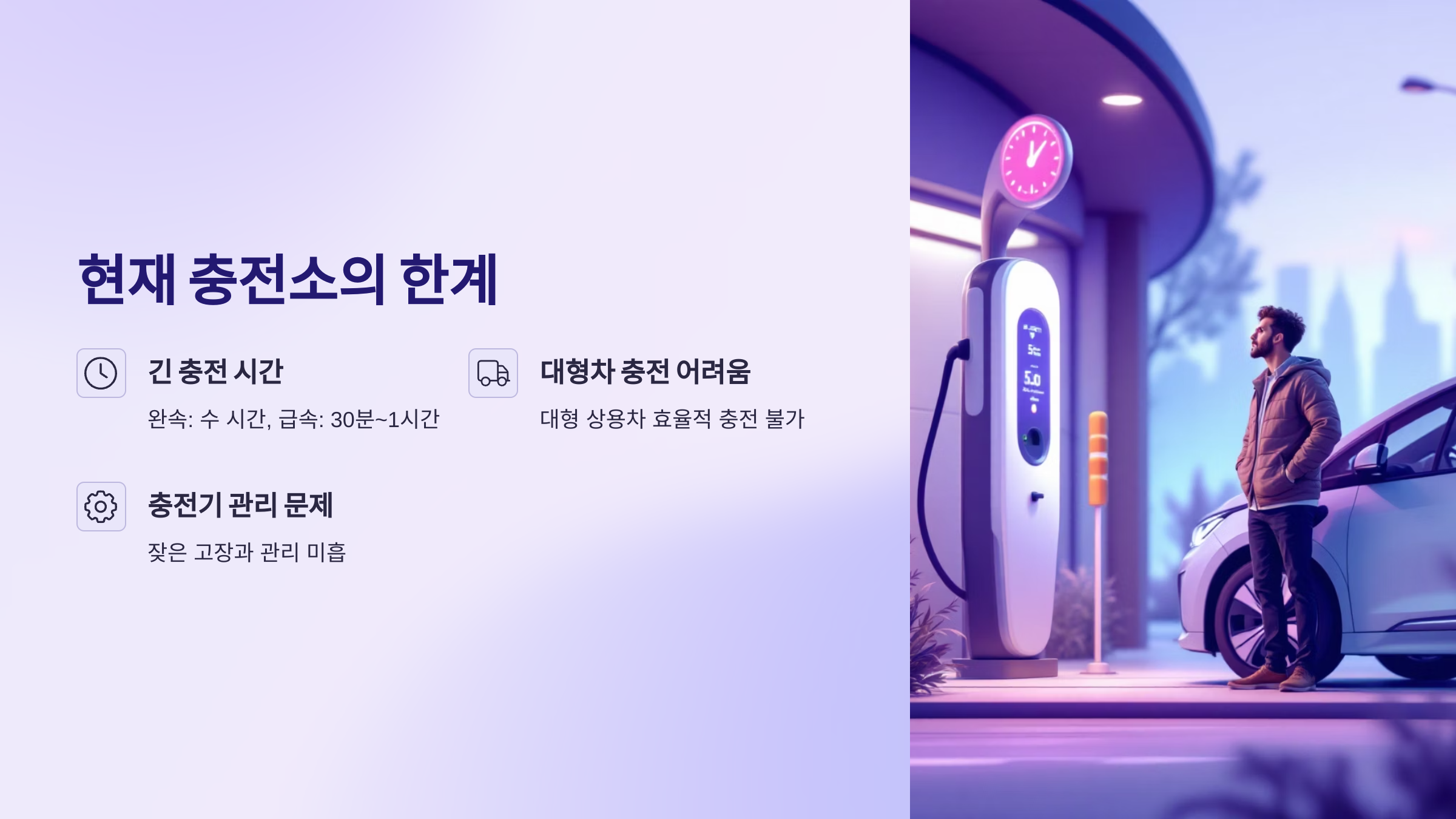 - 한계: 긴 충전 시간으로 인해 일상적인 빠른 충전 수요를 감당하기 어렵고, 긴급 상황 대처가 불가능합니다.