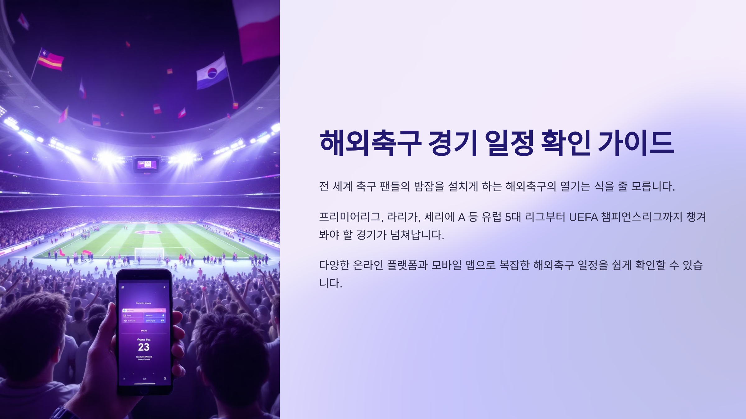 유럽의 빅리그부터 남미의 열정적인 무대까지, 전 세계 축구 팬들의 밤잠을 설치게 하는 해외축구의 열기는 식을 줄 모릅니다. 좋아하는 팀의 경기를 놓치지 않고 챙겨보는 것은 팬들에게 큰 즐거움이지만, 수많은 리그와 컵 대회가 동시에 진행되고 시차까지 고려해야 하기에 경기 일정을 정확히 파악하는 것이 때로는 번거롭게 느껴질 수 있습니다. 프리미어리그(EPL), 라리가, 세리에 A, 분데스리가, 리그앙 등 유럽 5대 리그는 물론, UEFA 챔피언스리그, 유로파리그 등 클럽 대항전까지, 챙겨봐야 할 경기는 넘쳐납니다. 다행히도 이제는 다양한 온라인 플랫폼과 모바일 애플리케이션을 통해 복잡한 해외축구 경기 일정을 손쉽게 확인하고 관리할 수 있습니다. 어떤 방법들을 통해 원하는 경기 정보를 놓치지 않고 얻을 수 있는지 알아보겠습니다.