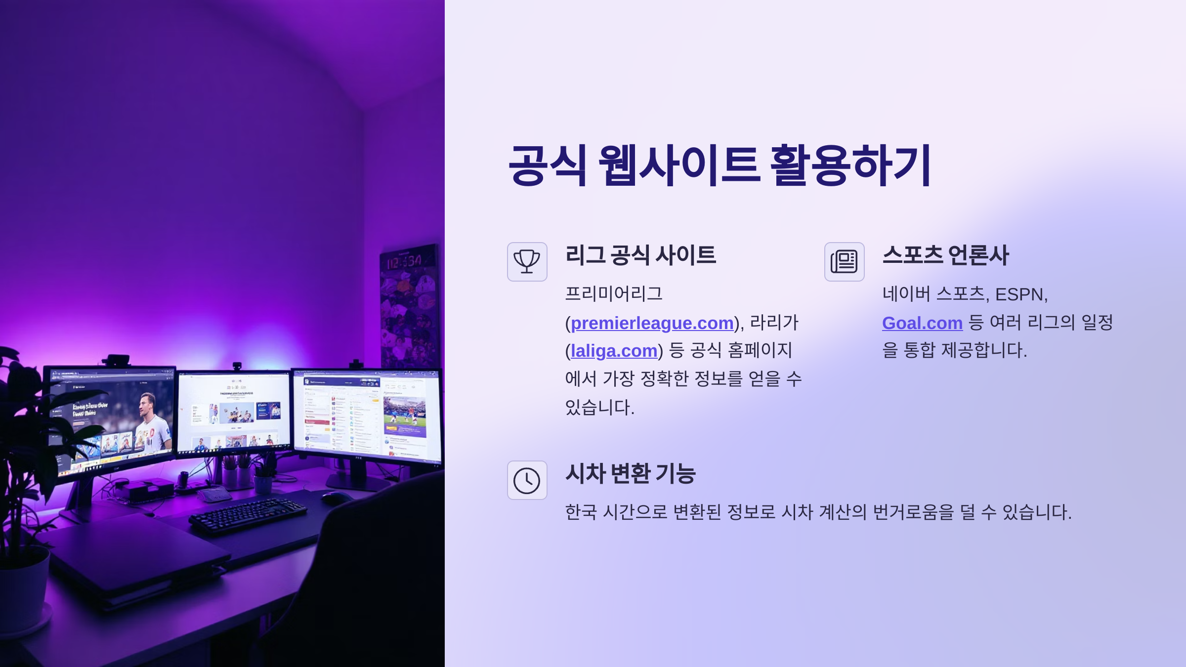 가장 정확하고 신뢰할 수 있는 경기 일정 정보는 각 리그의 공식 웹사이트에서 얻는 것입니다. 예를 들어, 프리미어리그 일정은 프리미어리그 공식 홈페이지(premierleague.com), 라리가는 라리가 공식 홈페이지(laliga.com)에서 직접 확인할 수 있습니다. 이들 공식 사이트는 리그 사무국에서 직접 관리하므로 경기 시간 변경이나 연기 등의 정보가 가장 빠르게 업데이트됩니다. 하지만 여러 리그를 동시에 확인하기에는 다소 불편할 수 있습니다. 이럴 때는 네이버 스포츠, 다음 스포츠와 같은 국내 대형 포털 사이트의 해외축구 섹션이나 ESPN, BBC Sport, Goal.com 등 해외 유명 스포츠 언론사의 웹사이트를 활용하는 것이 편리합니다. 이 플랫폼들은 여러 리그의 경기 일정을 통합하여 제공하며, 한국 시간으로 변환된 정보를 보여주는 경우가 많아 시차 계산의 번거로움을 덜 수 있습니다. 또한, 경기 일정뿐만 아니라 실시간 스코어, 뉴스, 순위 정보까지 한눈에 확인할 수 있다는 장점이 있습니다.