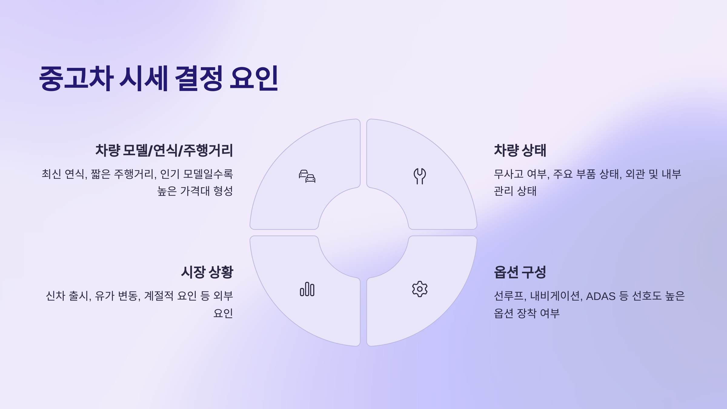 중고차 시세는 복합적인 요인들이 상호작용하여 결정됩니다. 가장 기본적으로는 차량 모델, 연식, 주행거리가 시세 형성에 큰 영향을 미칩니다. 일반적으로 최신 연식일수록, 주행거리가 짧을수록 높은 가격대를 형성하며, 인기 모델이나 브랜드는 감가율이 상대적으로 낮습니다. 여기에 차량의 상태가 중요한 변수로 작용합니다. 무사고 차량인지, 엔진이나 미션 등 주요 부품의 상태는 양호한지, 외관의 흠집이나 내부 관리 상태는 어떤지에 따라 가격이 크게 달라질 수 있습니다. 또한, 옵션 구성도 시세에 영향을 미칩니다. 선루프, 내비게이션, 첨단 운전자 보조 시스템(ADAS) 등 선호도 높은 옵션이 장착된 차량은 그렇지 않은 차량보다 높은 가격에 거래될 가능성이 높습니다. 마지막으로 시장 상황도 무시할 수 없습니다. 특정 모델의 신차 출시, 유가 변동, 계절적 요인(예: 여름철 SUV 수요 증가) 등 외부 요인에 의해서도 중고차 시세는 변동성을 보입니다.