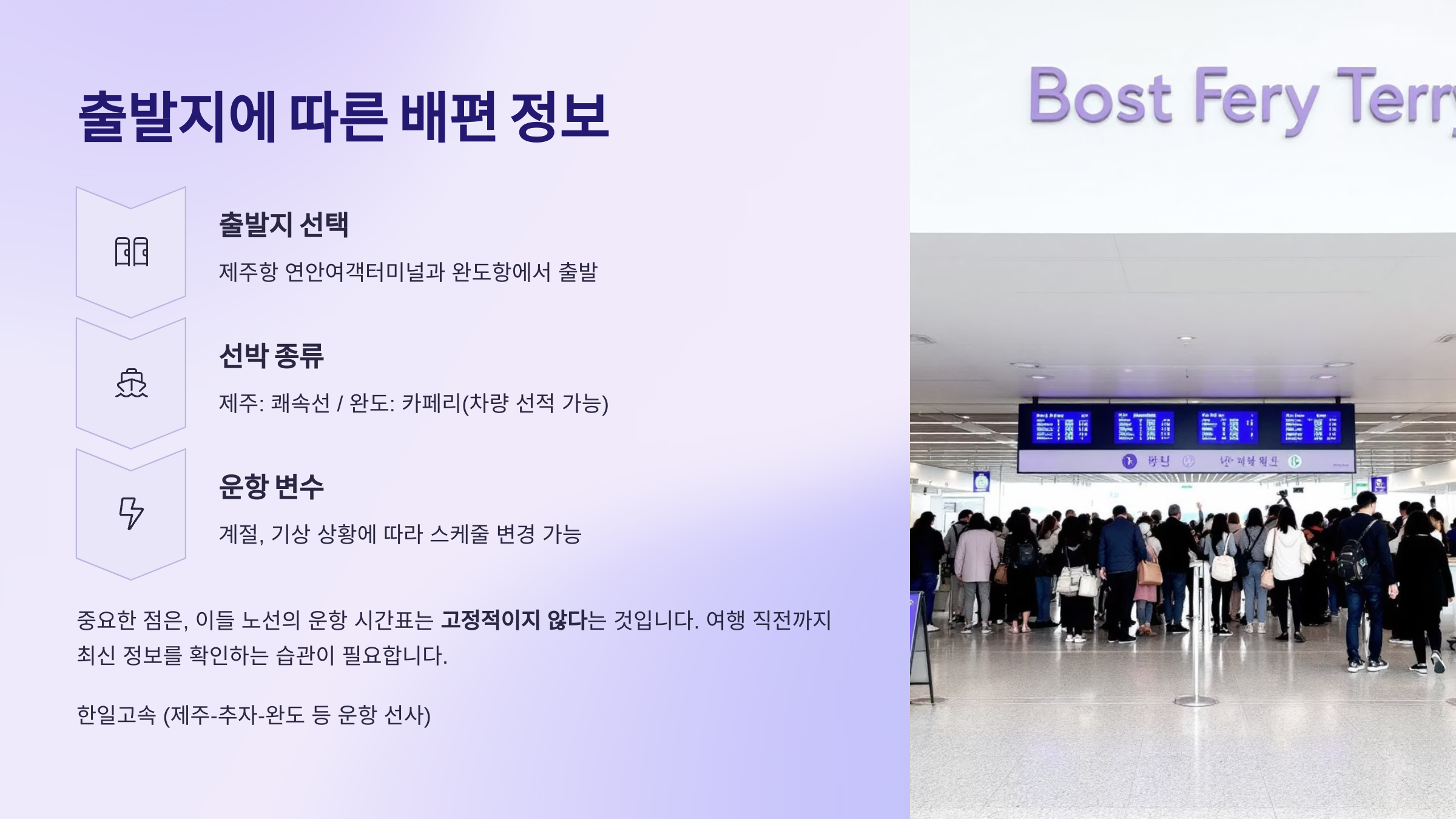 추자도로 향하는 배편은 주로 제주항 연안여객터미널과 전라남도 완도항에서 출발합니다. 어떤 항구에서 출발하느냐에 따라 운항하는 선사, 소요 시간, 요금 등이 달라지므로 자신의 여행 계획에 맞는 출발지를 선택하는 것이 중요합니다. 제주에서 출발하는 경우, 쾌속선을 이용하면 비교적 빠른 시간 안에 추자도에 도착할 수 있으며, 완도에서 출발하는 배편은 차량 선적이 가능한 카페리인 경우가 많아 자가용을 가지고 섬 여행을 계획하는 분들에게 유리할 수 있습니다. 중요한 점은, 이들 노선의 운항 시간표는 고정적이지 않다는 것입니다. 동절기/하절기 등 계절에 따라 스케줄이 변경되는 것은 물론, 기상 상황(풍랑주의보 등)에 따라 예고 없이 결항되거나 운항 시간이 지연될 수 있습니다. 또한, 특별 수송 기간이나 선박 정비 등의 이유로 스케줄이 임시 변경될 수도 있으므로, 여행 직전까지 최신 정보를 확인하는 습관이 필요합니다. 특히 추자도는 상추자도와 하추자도 두 개의 항구에 기항하는 경우가 많으므로, 내가 이용할 배편이 어느 항구에 도착하는지도 미리 확인해야 합니다.