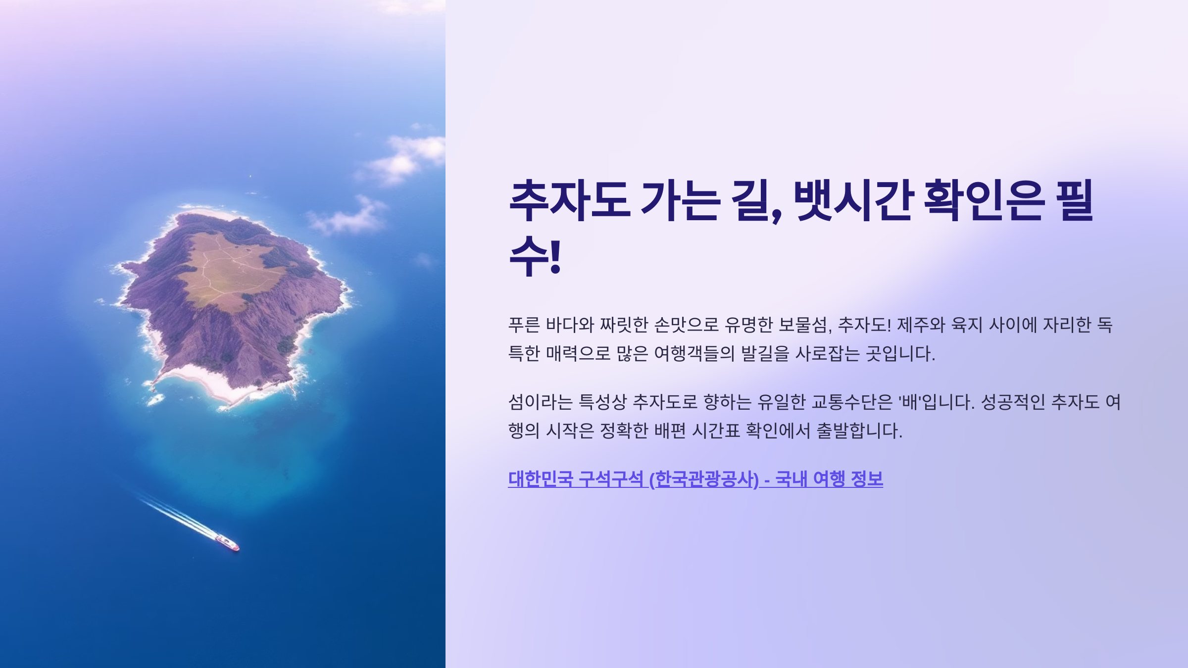 푸른 바다와 짜릿한 손맛으로 유명한 보물섬, 추자도! 제주와 육지 사이에 자리한 독특한 매력으로 많은 여행객들의 발길을 사로잡는 곳입니다. 하지만 섬이라는 특성상 추자도로 향하는 유일한 교통수단은 바로 '배'입니다. 그렇기에 성공적인 추자도 여행의 시작은 정확한 배편 시간표를 확인하는 것에서부터 출발합니다. 날씨와 계절, 운항 선사 사정에 따라 수시로 변동될 수 있는 것이 뱃길이기에, 꼼꼼한 사전 정보 확인은 즐거운 여행을 위한 필수 준비 과정이라 할 수 있습니다. 낭만적인 섬 여행을 꿈꾸며, 추자도 배편 시간표를 어떻게 확인하고 준비해야 하는지 알아보겠습니다.