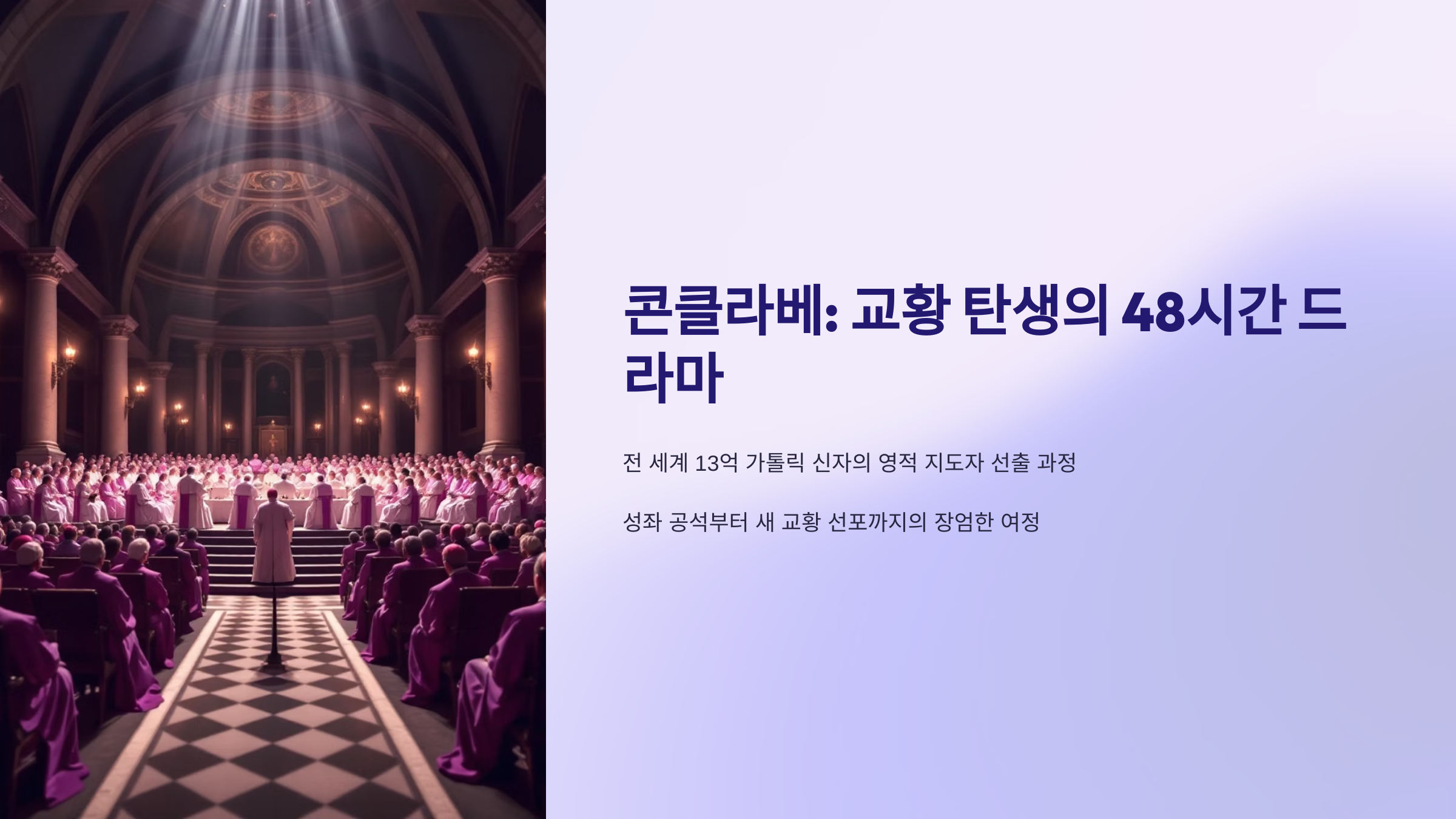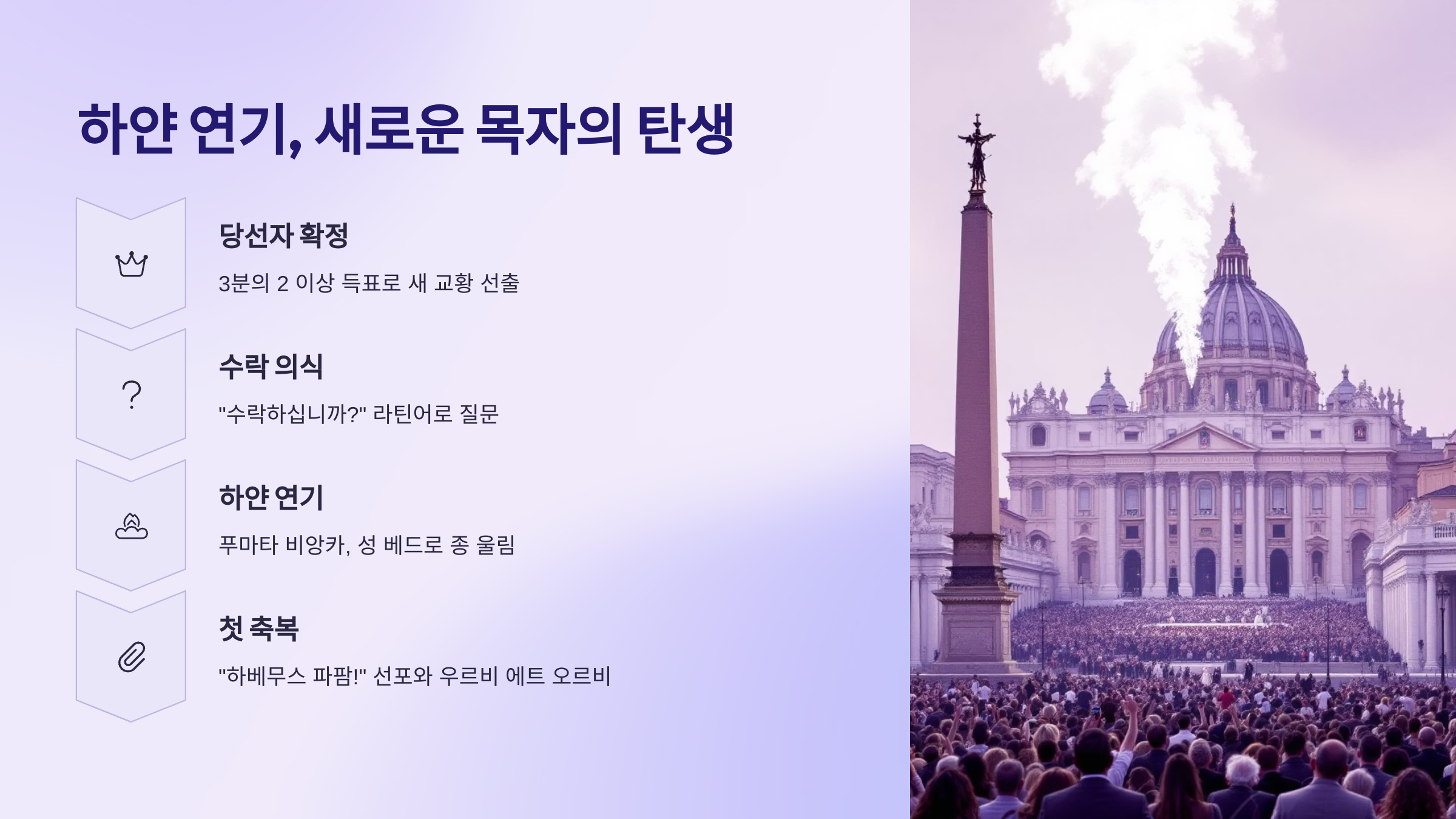 새 교황의 첫인사, "하베무스 파팜!" (Habemus Papam!): 하얀 연기가 피어오른 후 약 한 시간 정도가 지나면, 추기경단 선임 부제 추기경이 성 베드로 대성당 중앙 발코니에 나타나 라틴어로 "하베무스 파팜!(Habemus Papam! 우리에게 교황이 생겼습니다!)"이라고 외치며 새 교황의 이름과 그가 선택한 교황명을 전 세계에 공포합니다. 곧이어 흰색 수단을 입은 새로운 교황이 발코니에 모습을 드러내고, 감격에 젖은 군중을 향해 첫 번째 축복인 '우르비 에트 오르비(Urbi et Orbi, 로마와 전 세계에)'를 내립니다. 이로써 48시간, 혹은 그 이상의 드라마는 새로운 희망과 함께 막을 내리고, 가톨릭 교회는 새로운 목자와 함께 또 다른 역사의 페이지를 열게 됩니다.