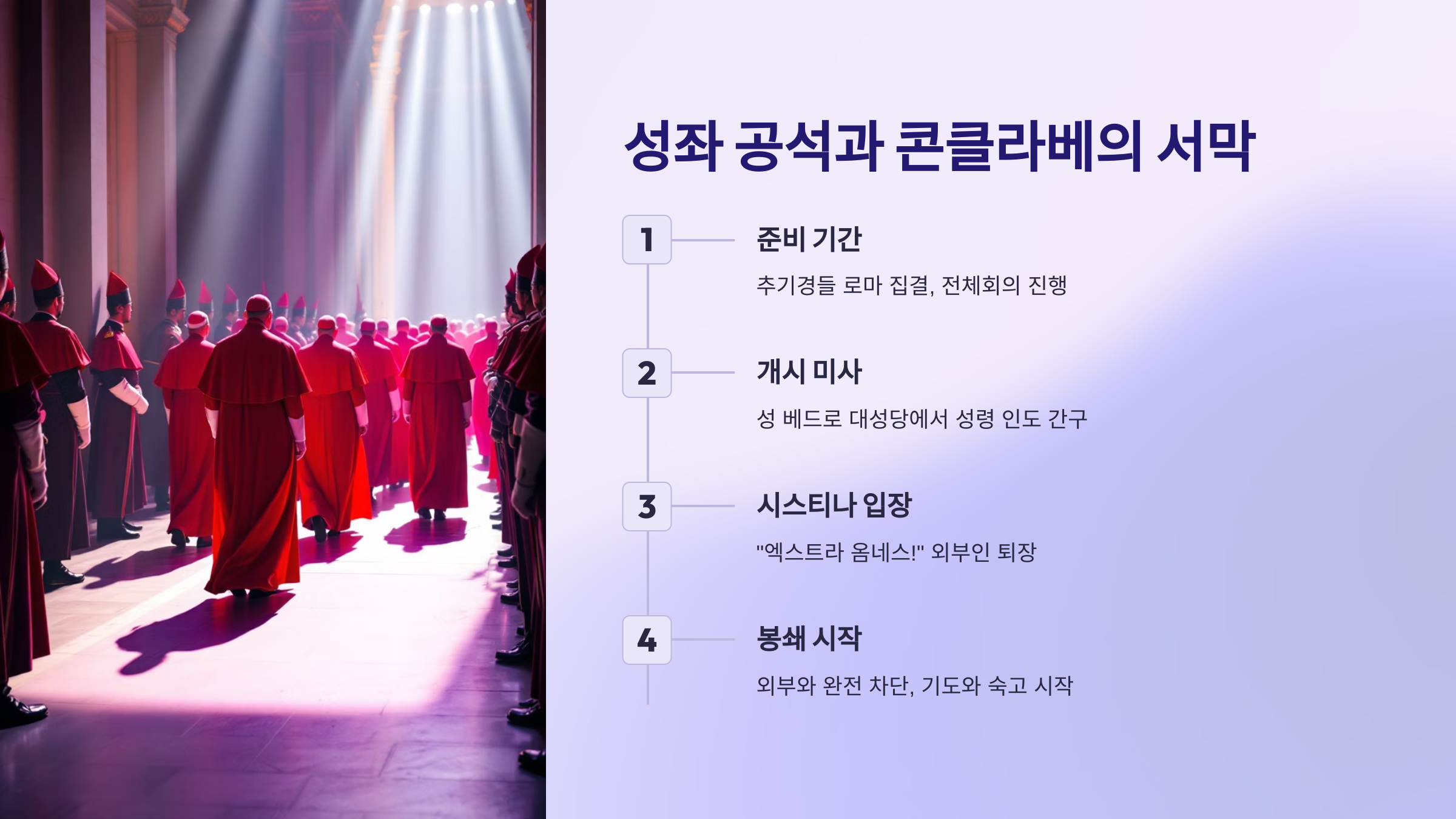 콘클라베 시작 수 시간 전: 선거인 추기경들은 지정된 시간에 성 베드로 대성당에 모여 콘클라베 개시를 위한 장엄 미사를 봉헌합니다. 이 미사는 성령의 인도를 간구하며 올바른 선택을 할 수 있도록 은총을 청하는 의미를 지닙니다. 미사 후 추기경들은 성가대의 성령송가를 따라 엄숙한 행렬을 이루어 시스티나 경당으로 향합니다. 각 추기경의 이름이 호명되고, 미켈란젤로의 '최후의 심판' 프레스코화 아래 마련된 자신의 자리에 착석합니다.