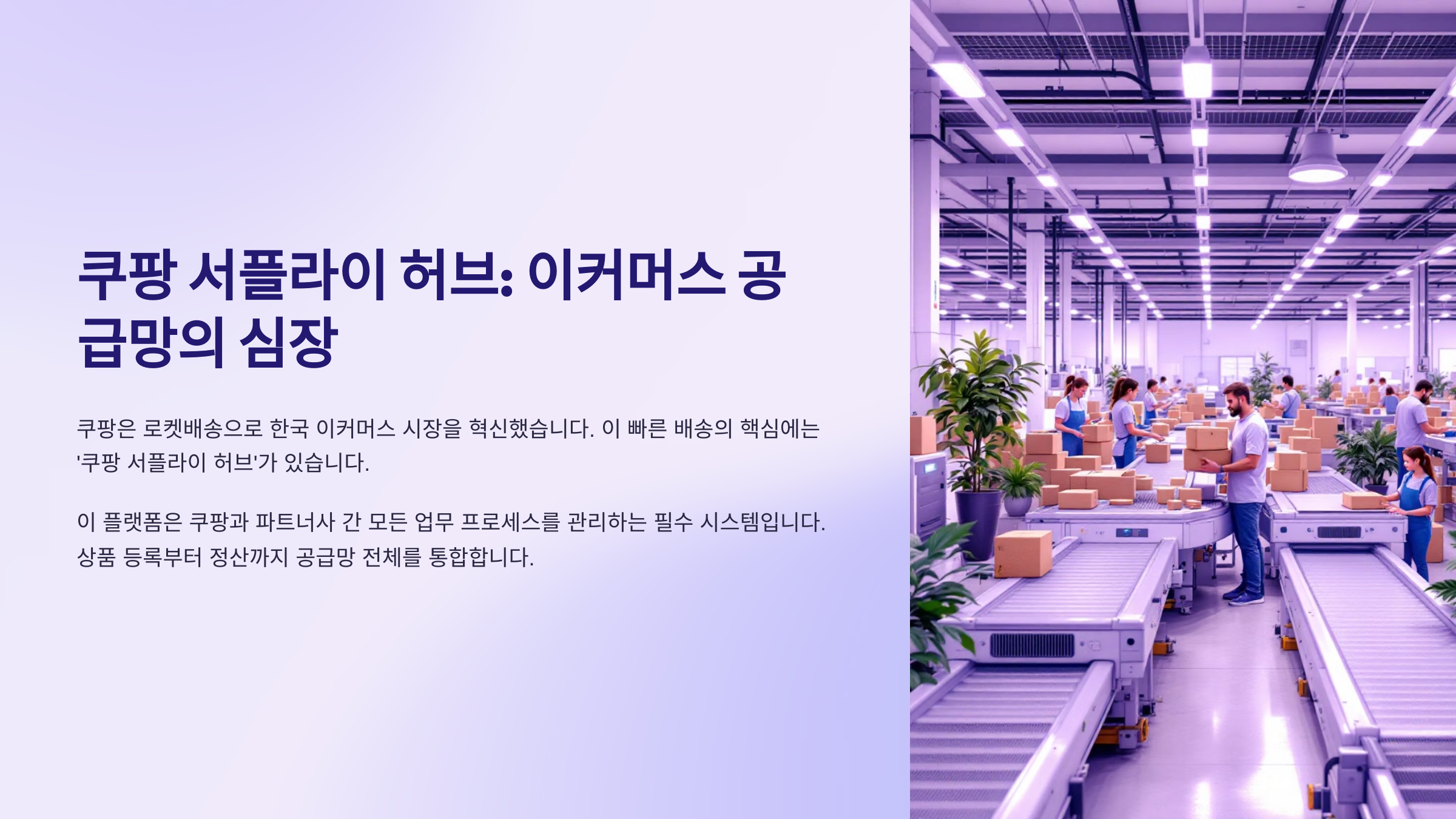 쿠팡은 대한민국 이커머스 시장을 선도하며 로켓배송이라는 혁신적인 서비스로 우리의 쇼핑 경험을 바꿔 놓았습니다. 이렇게 빠르고 안정적인 상품 공급이 가능한 배경에는 수많은 파트너사(공급업체)와의 긴밀하고 효율적인 협업 시스템이 자리 잡고 있습니다. 그 중심축 역할을 하는 것이 바로 '쿠팡 서플라이 허브(Coupang Supplier Hub)'입니다. 이는 쿠팡과 상품을 공급하는 파트너사 간의 모든 업무 프로세스를 관리하고 소통하는 필수적인 온라인 플랫폼으로, 쿠팡과의 비즈니스를 위한 관문이자 핵심 운영 도구라고 할 수 있습니다. 단순히 정보를 주고받는 채널을 넘어, 상품 등록부터 발주 확인, 입고 관리, 정산에 이르기까지 공급망 전체를 아우르는 통합적인 시스템으로 기능합니다.