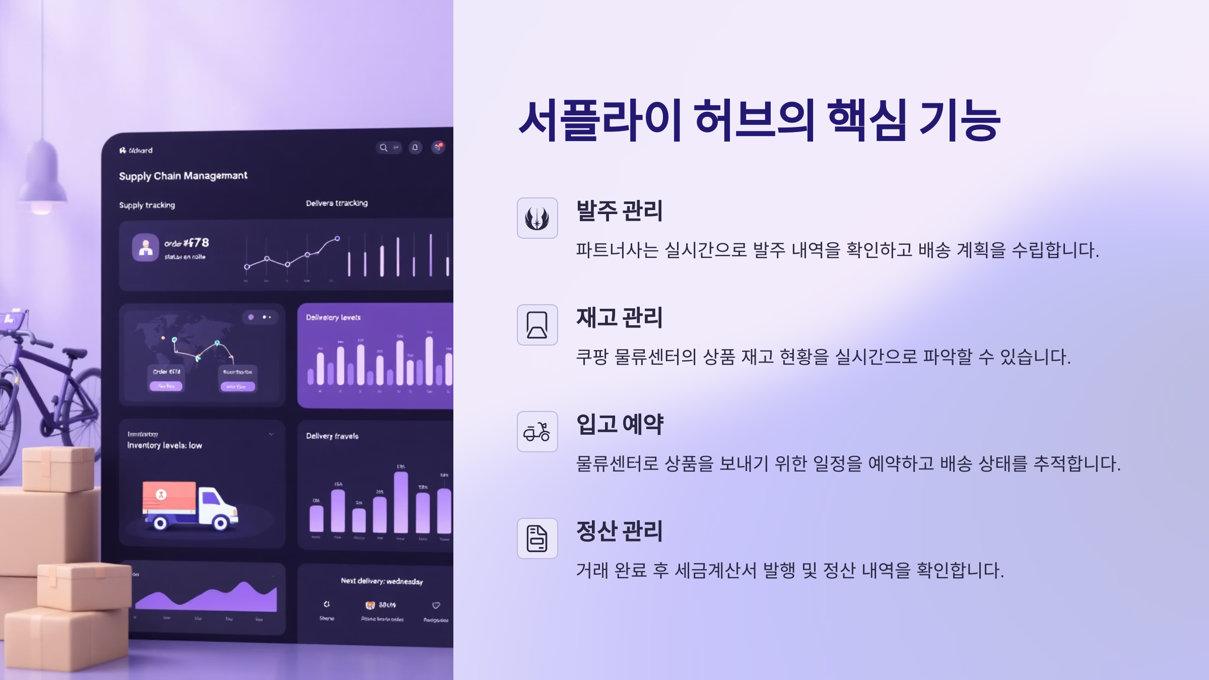쿠팡 서플라이 허브, Coupang Supplier Hub, 쿠팡 파트너, 공급망 관리, SCM, 이커머스, 쿠팡 발주, 쿠팡 입고, 쿠팡 정산, 로켓배송