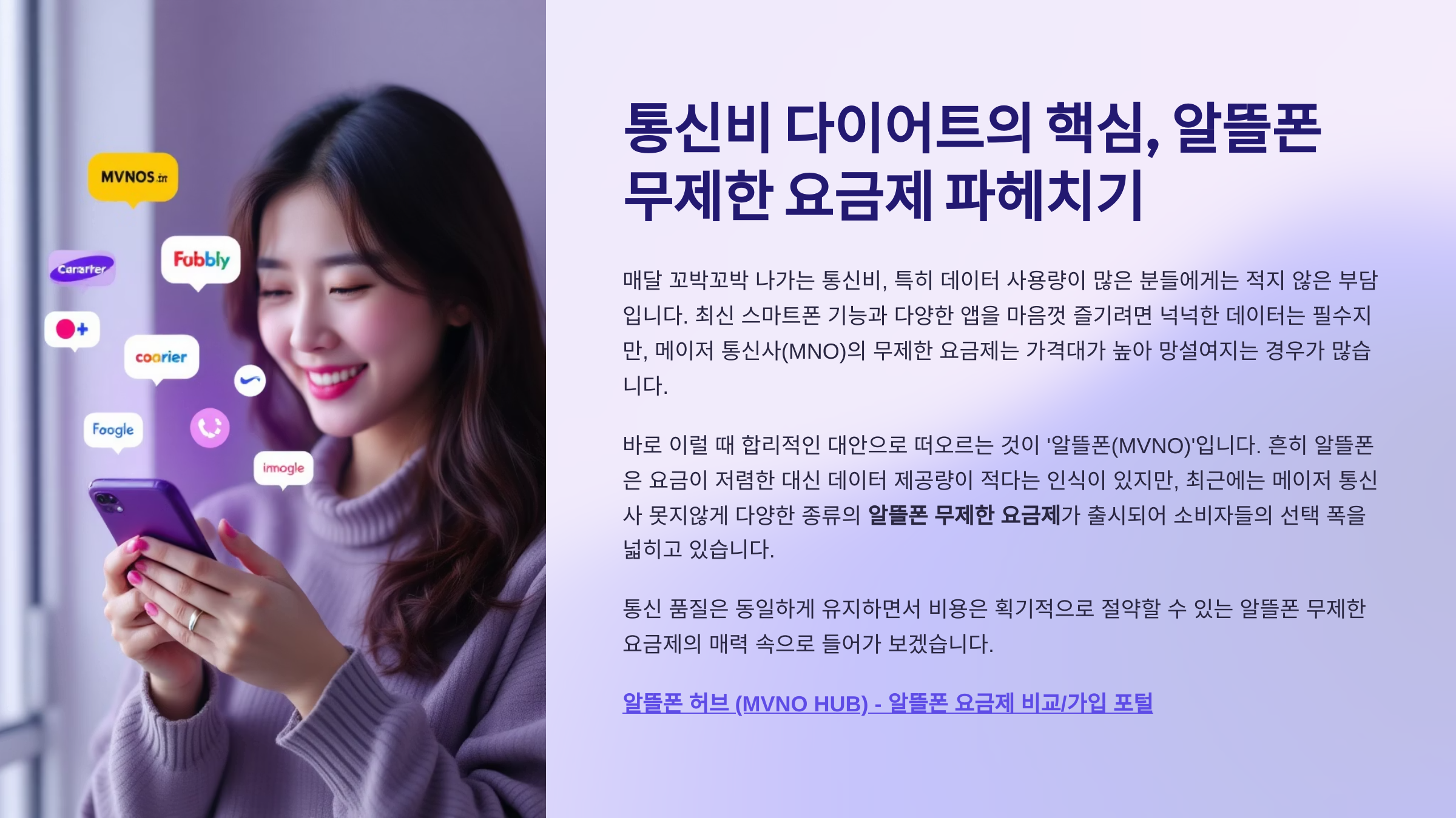 매달 꼬박꼬박 나가는 통신비, 특히 데이터 사용량이 많은 분들에게는 적지 않은 부담입니다. 최신 스마트폰 기능과 다양한 앱을 마음껏 즐기려면 넉넉한 데이터는 필수지만, 메이저 통신사(MNO)의 무제한 요금제는 가격대가 높아 망설여지는 경우가 많습니다. 바로 이럴 때 합리적인 대안으로 떠오르는 것이 '알뜰폰(MVNO)'입니다. 흔히 알뜰폰은 요금이 저렴한 대신 데이터 제공량이 적다는 인식이 있지만, 최근에는 메이저 통신사 못지않게 다양한 종류의 알뜰폰 무제한 요금제가 출시되어 소비자들의 선택 폭을 넓히고 있습니다. 통신 품질은 동일하게 유지하면서 비용은 획기적으로 절약할 수 있는 알뜰폰 무제한 요금제의 매력 속으로 들어가 보겠습니다.