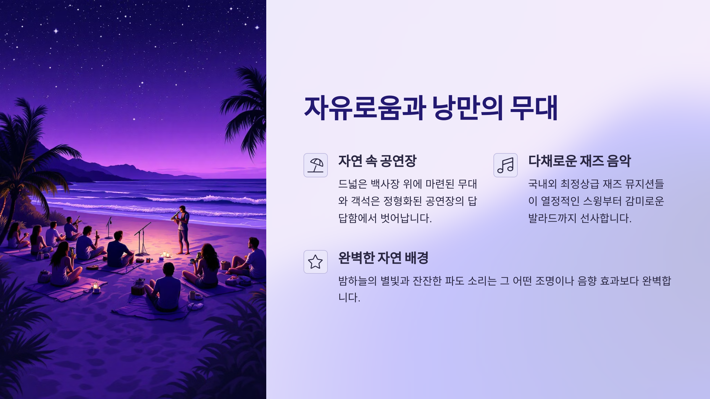 단순한 음악 축제를 넘어, 아름다운 해변 자체를 거대한 무대 삼아 펼쳐지는 이 축제는 국내외 재즈 애호가들은 물론, 특별한 여름밤의 추억을 만들고 싶은 이들에게 최고의 선물이 되고 있습니다.