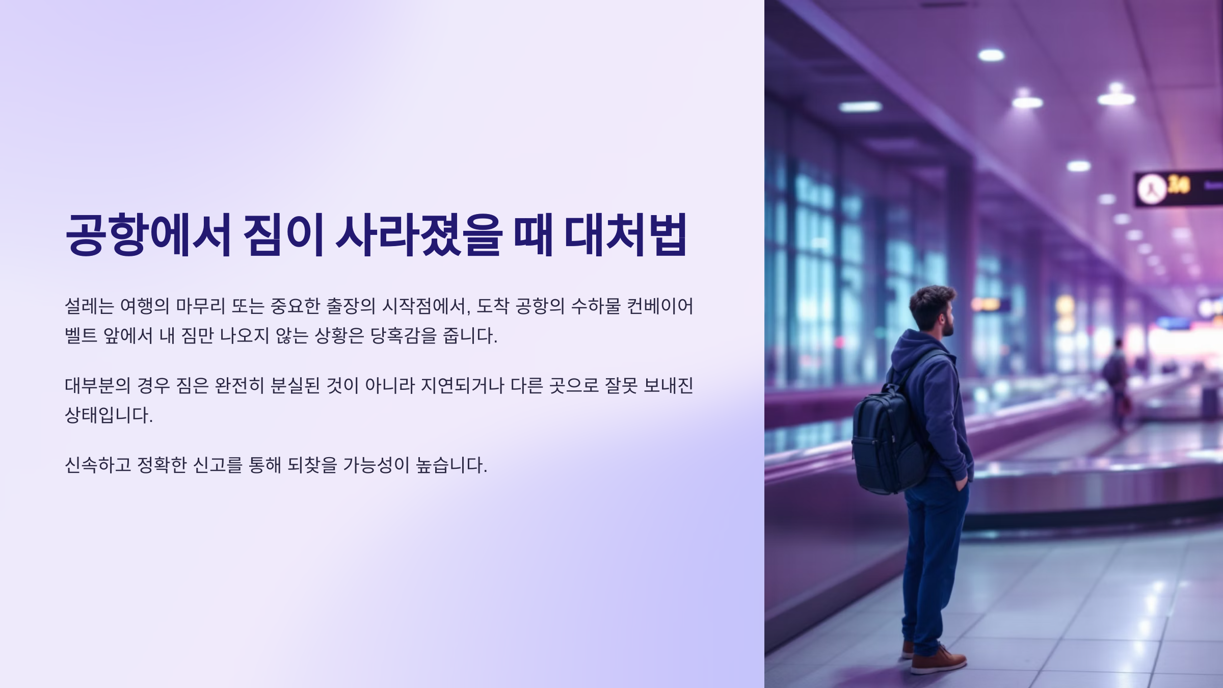 설레는 여행의 마무리 또는 중요한 출장의 시작점에서, 도착 공항의 수하물 컨베이어 벨트 앞에서 내 짐만 나오지 않는 상황은 상상만으로도 아찔합니다. 벨트는 멈췄는데 내 캐리어는 보이지 않고, 주변 사람들은 모두 짐을 찾아 떠나가는 모습은 당혹감과 불안감을 증폭시킵니다. 하지만 이런 예기치 못한 상황에 부닥쳤을 때, 당황하지 않고 침착하게 올바른 절차를 밟는 것이 무엇보다 중요합니다. 대부분의 경우 짐은 완전히 분실된 것이 아니라 지연되거나 다른 곳으로 잘못 보내진 상태이며, 신속하고 정확한 신고를 통해 되찾을 가능성이 훨씬 높습니다. 지금부터 도착 공항에서 수하물이 분실되었을 때 즉시 취해야 할 행동 요령과 알아두어야 할 사항들을 차근차근 안내해 드립니다.