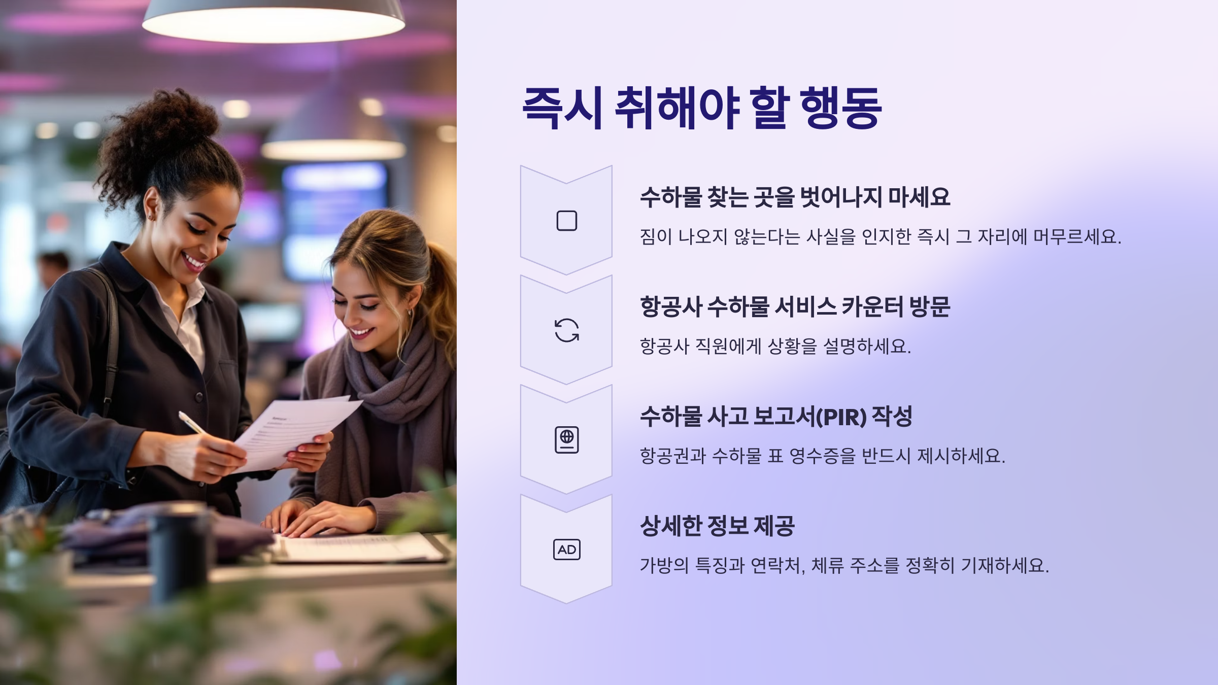 가장 먼저 해야 할 일은 절대 수하물 찾는 곳(Baggage Claim Area)을 벗어나지 않는 것입니다. 짐이 나오지 않는다는 사실을 인지한 즉시, 해당 지역 내에 위치한 이용 항공사의 수하물 서비스 카운터를 찾아가야 합니다. 항공사 직원에게 상황을 설명하고, 수하물 사고 보고서(Property Irregularity Report, PIR)를 작성하는 것이 필수적입니다. 이 보고서는 분실된 수하물을 추적하고 관리하는 공식적인 첫 단계입니다. 보고서 작성 시에는 항공권(탑승권)과 함께 발권 시 캐리어에 부착했던 수하물 표(Baggage Tag) 영수증을 반드시 제시해야 합니다. 이 영수증에는 고유한 추적 번호가 있어 짐을 찾는 데 결정적인 역할을 합니다. 또한, 분실된 가방의 색상, 크기, 브랜드, 재질, 그리고 눈에 띄는 특징(스티커, 액세서리 등)을 최대한 상세하게 설명해야 합니다. 연락 가능한 전화번호와 현지 체류 주소 또는 최종 목적지 주소를 정확히 기재하는 것도 중요합니다.
