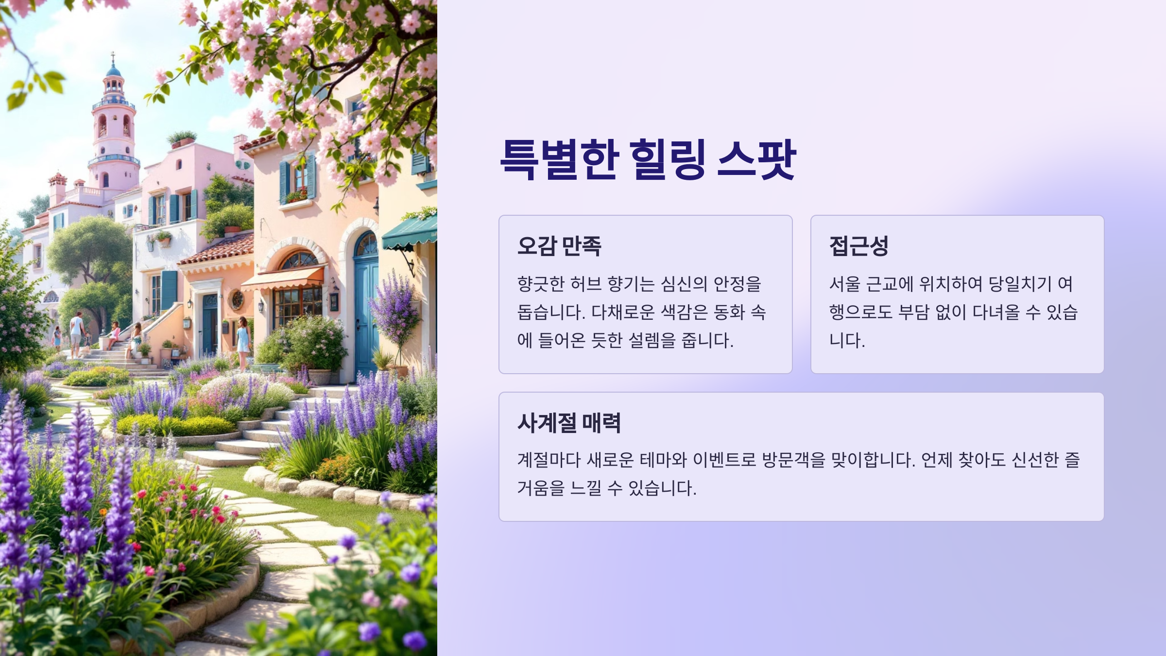 서울 근교, 경기도 포천시에 위치한 허브아일랜드는 복잡한 도심을 벗어나 잠시 동화 같은 세상으로 떠나고 싶은 이들에게 안성맞춤인 곳입니다. 이름처럼 향긋한 허브를 테마로 지중해의 작은 마을을 그대로 옮겨 놓은 듯한 이국적인 풍경을 자랑하며, 단순한 식물원을 넘어 보고, 듣고, 맛보고, 향기를 느끼는 오감 만족의 복합 문화 공간으로 꾸며져 있습니다. 사계절 내내 다채로운 허브의 향연과 아름다운 경관을 선사하며, 방문객들에게 특별한 휴식과 즐거운 추억을 안겨주는 매력적인 힐링 스팟으로 사랑받고 있습니다.