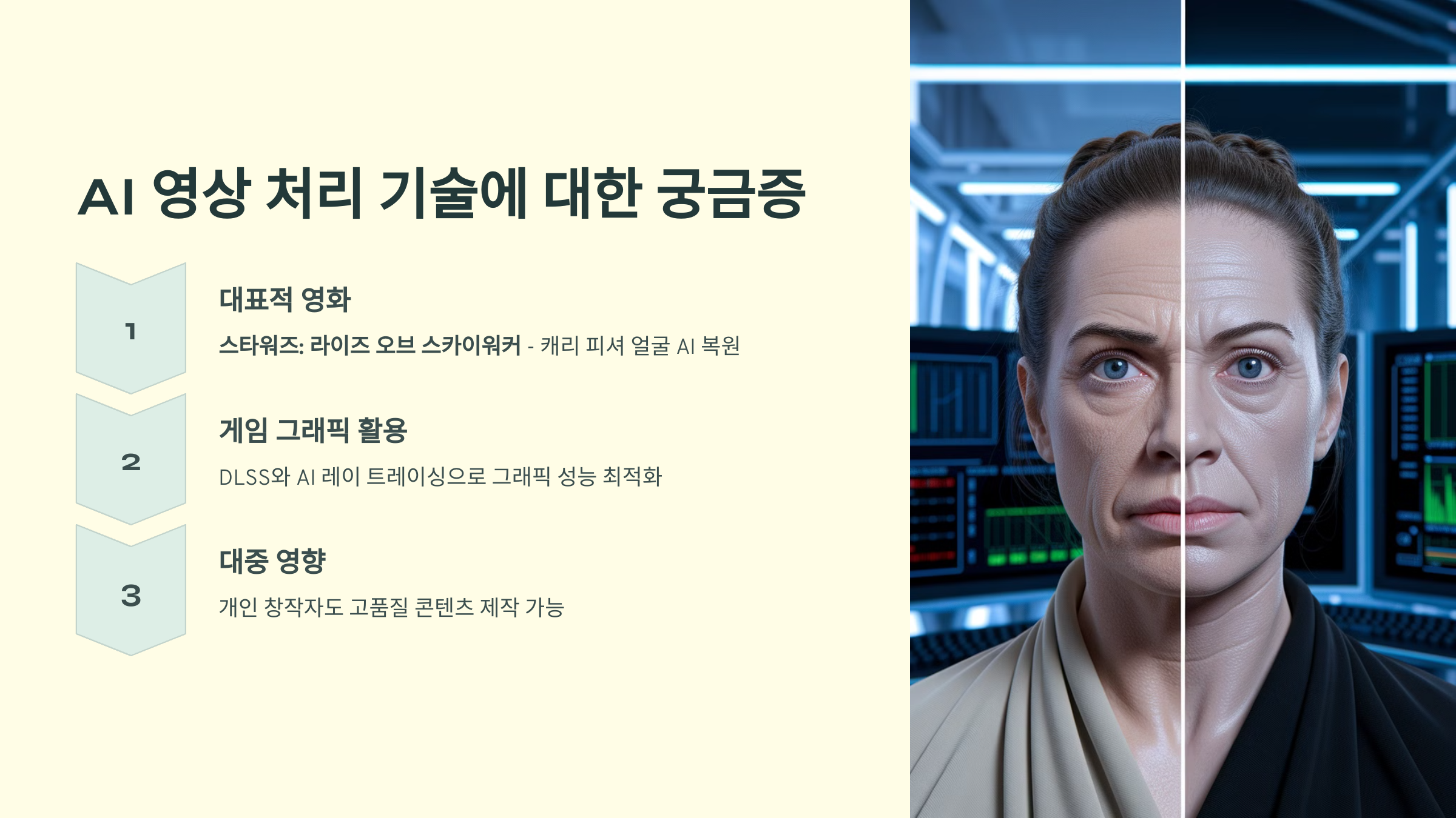 AI 영상 처리 기술은 영화와 게임 산업에서 혁신을 주도하고 있습니다. 최근 몇 년 동안 인공지능(AI)은 영상의 해상도를 높이고, 실시간 렌더링을 개선하며, 배우의 디지털 복제까지 가능하게 만들었습니다.