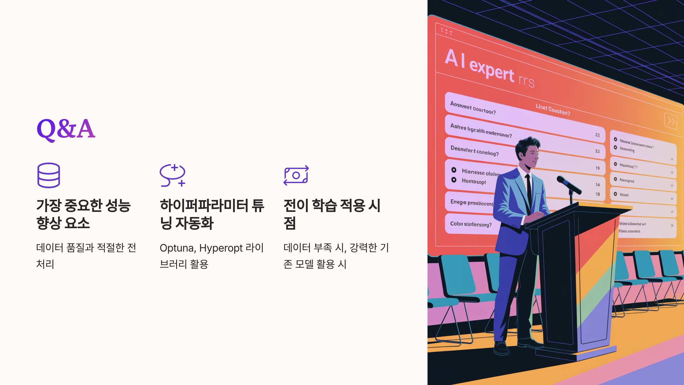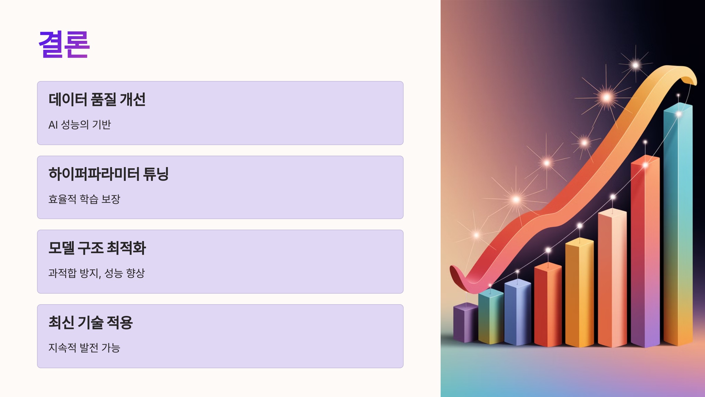 AI 모델의 성능을 향상시키기 위해서는 데이터 품질 개선, 하이퍼파라미터 튜닝, 모델 구조 최적화, 최신 기술 적용이 필수적입니다.