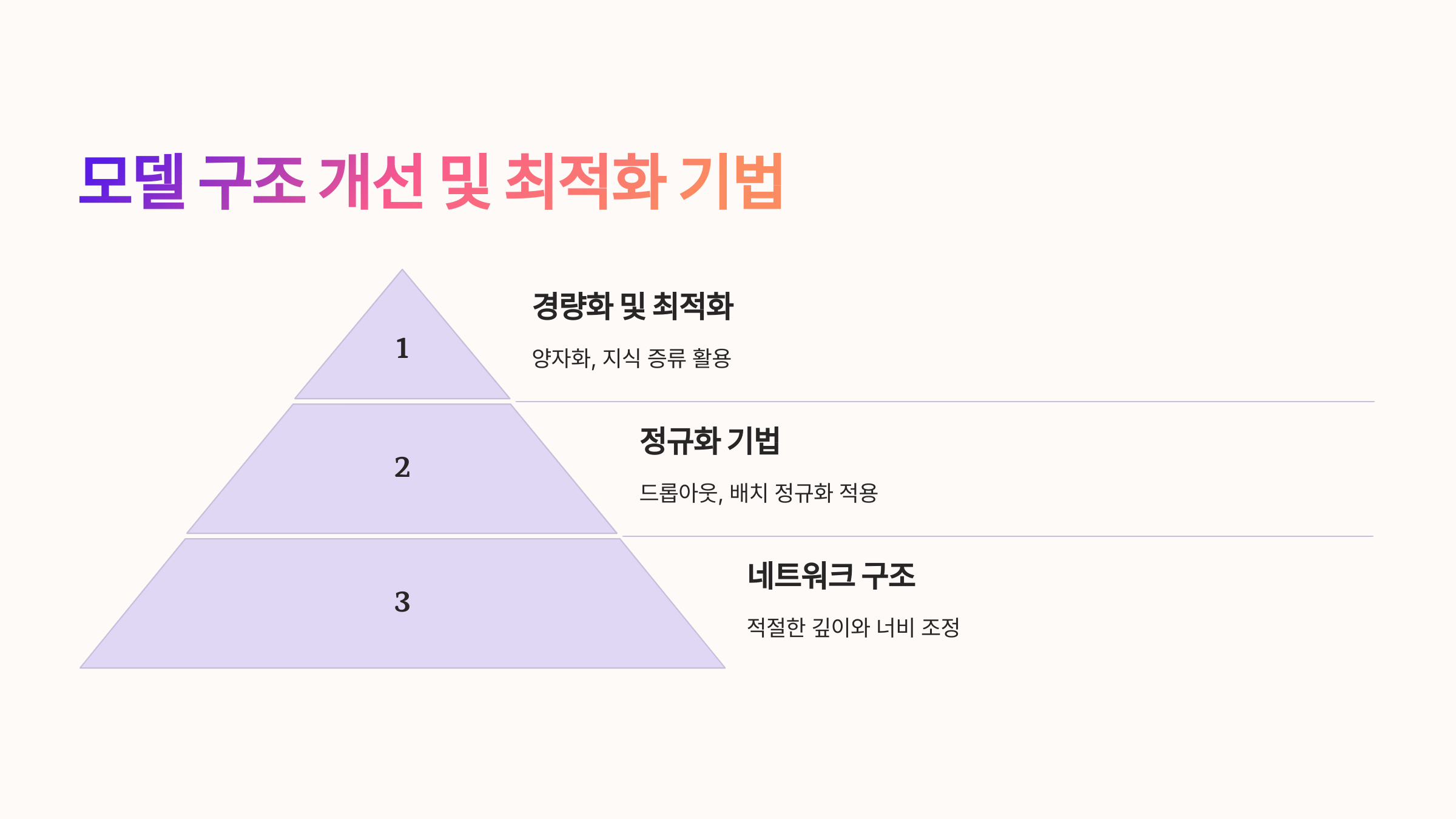 - 모델 경량화를 위해 양자화(Quantization) 및 지식 증류(Knowledge Distillation)를 활용할 수 있습니다.