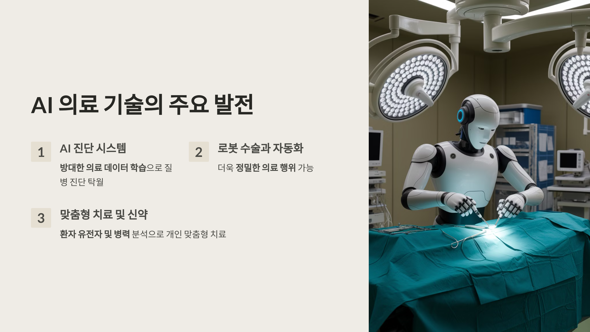 AI 기반 진단 시스템, 로봇 수술, 맞춤형 치료 등이 등장하면서 의료 환경이 변화하고 있는데요.