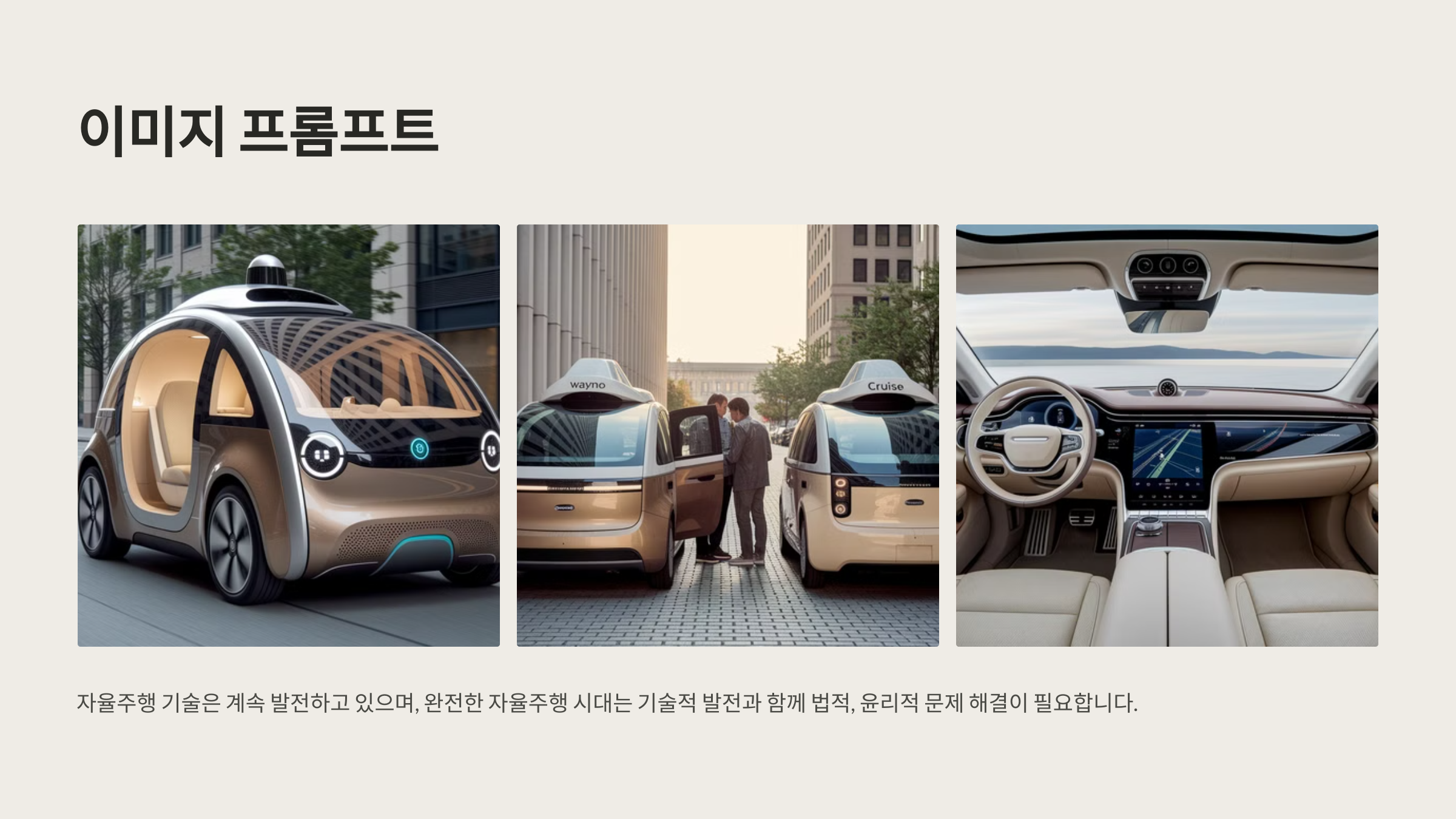 🖼 "미래형 자율주행 자동차가 도심을 달리는 모습, 스마트 센서와 AI 인터페이스가 표시된 자동차 내부 장면"