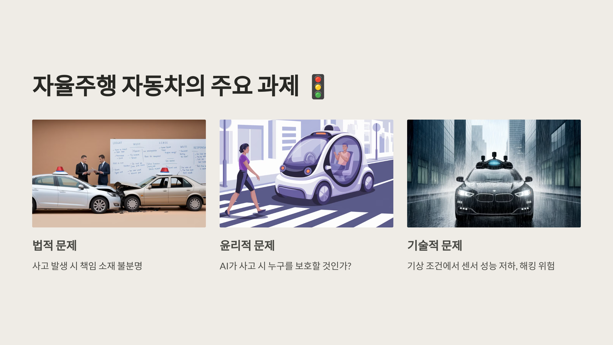 - 자율주행 차량 사고 발생 시 책임 소재 불분명
