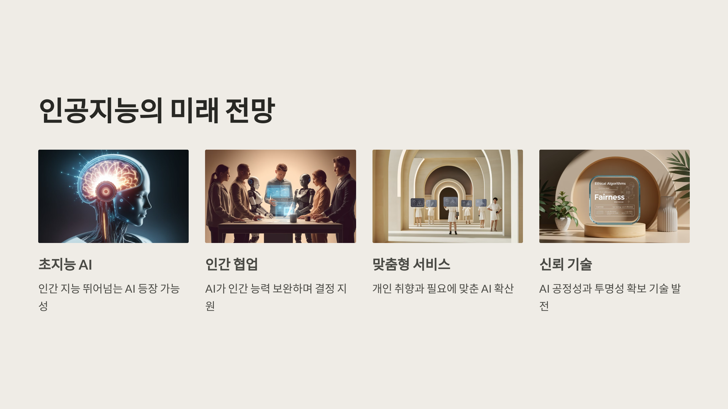 - 초지능 AI(Super AI)의 가능성: 인간의 지능을 뛰어넘는 AI가 등장할 수도 있어요.