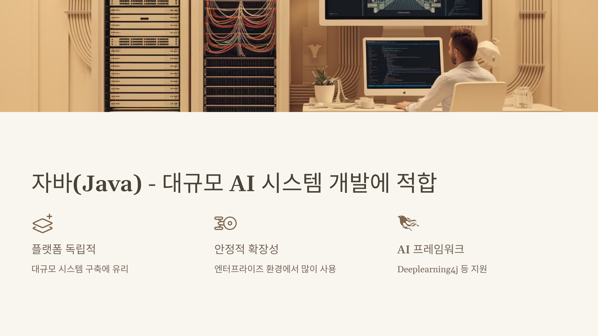 📌 자바는 기업 환경에서 AI 시스템을 구축할 때 주로 사용되며, 안정성과 확장성이 중요한 프로젝트에 적합합니다.