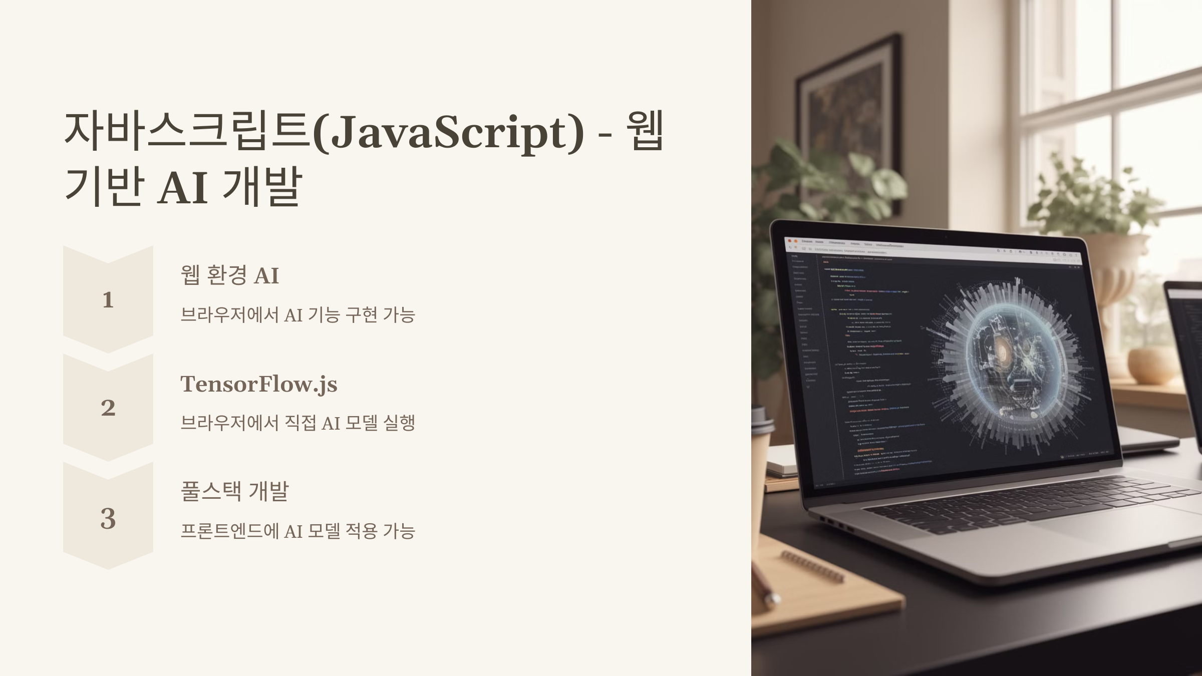 📌 자바스크립트는 웹에서 실행 가능한 AI 애플리케이션을 개발할 때 유용하며, 프론트엔드와 백엔드 모두에서 활용될 수 있습니다.