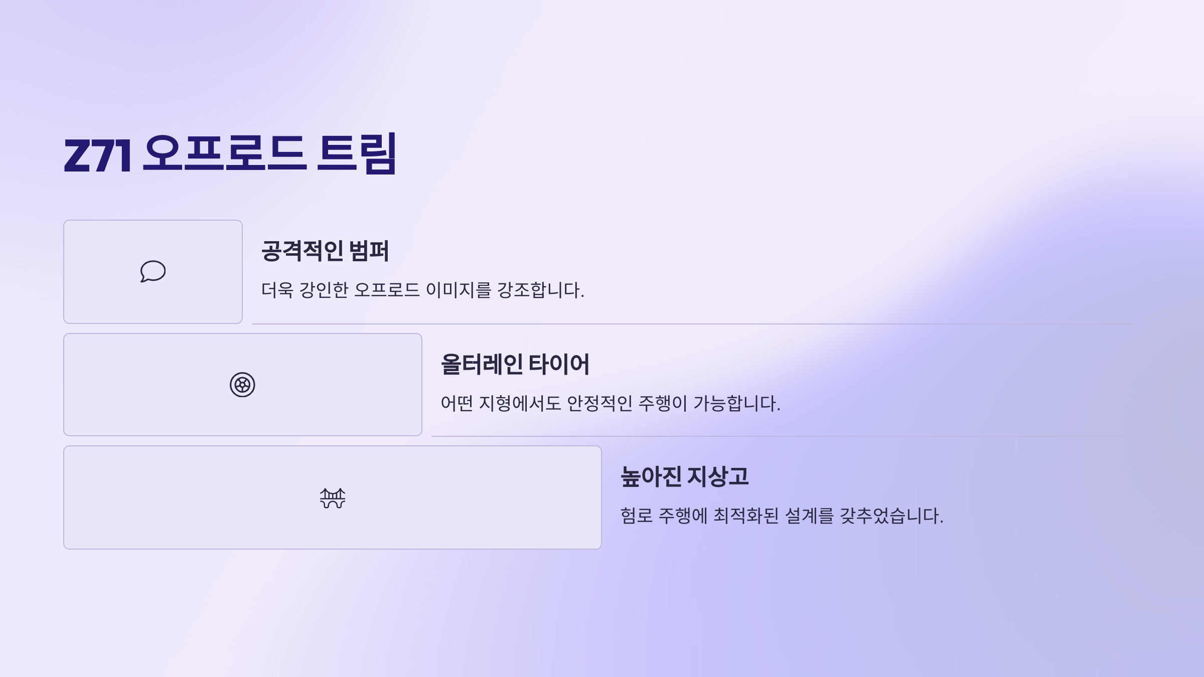 2. 최근 공개된 2024 쉐보레 트래버스 포토 중 특히 Z71 오프로드 트림의 사진들을 자세히 살펴보니, 캠핑이나 아웃도어 활동을 즐기는 저에게 필요한 기능과 디자인을 갖추고 있어 기대감이 더욱 커졌습니다.